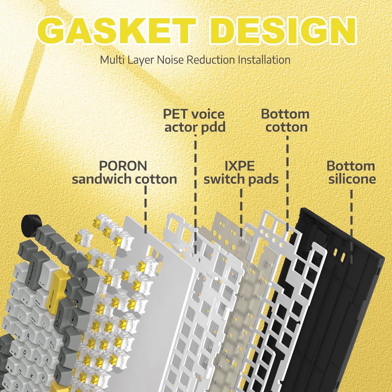 ⭐【Struktura USZCZELKI】 Struktura USZCZELKI i płytka pozycjonująca PC z bocznymi szczelinami optymalizują wyczucie klawiszy i poprawiają stabilność klawiszy oraz wrażenia z wprowadzania danych. W połączeniu z pięcioma warstwami podkładek redukujących hałas, takich jak bawełna warstwowa PORON i podkładki pod osią IXPE, hałas jest znacznie zmniejszony, a Ty możesz cieszyć się wygodnym i gładkim wyczuciem klawiatury niezależnie od tego, czy stukniesz, czy mocno naciśniesz.