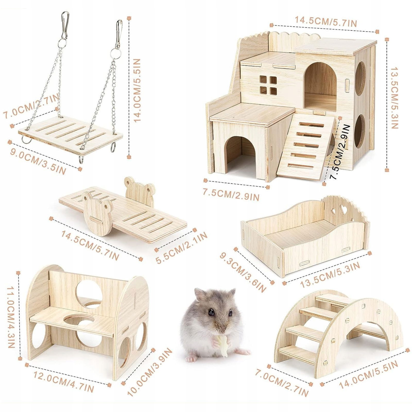 Duży zestaw naturalnych elementów wyposażenia klatki chomika. Zestaw 6szt różnych przedmiotów pozwoli stworzyć mnóstwo miejsca do zabawy i eksploracji dla Twojego chomika!