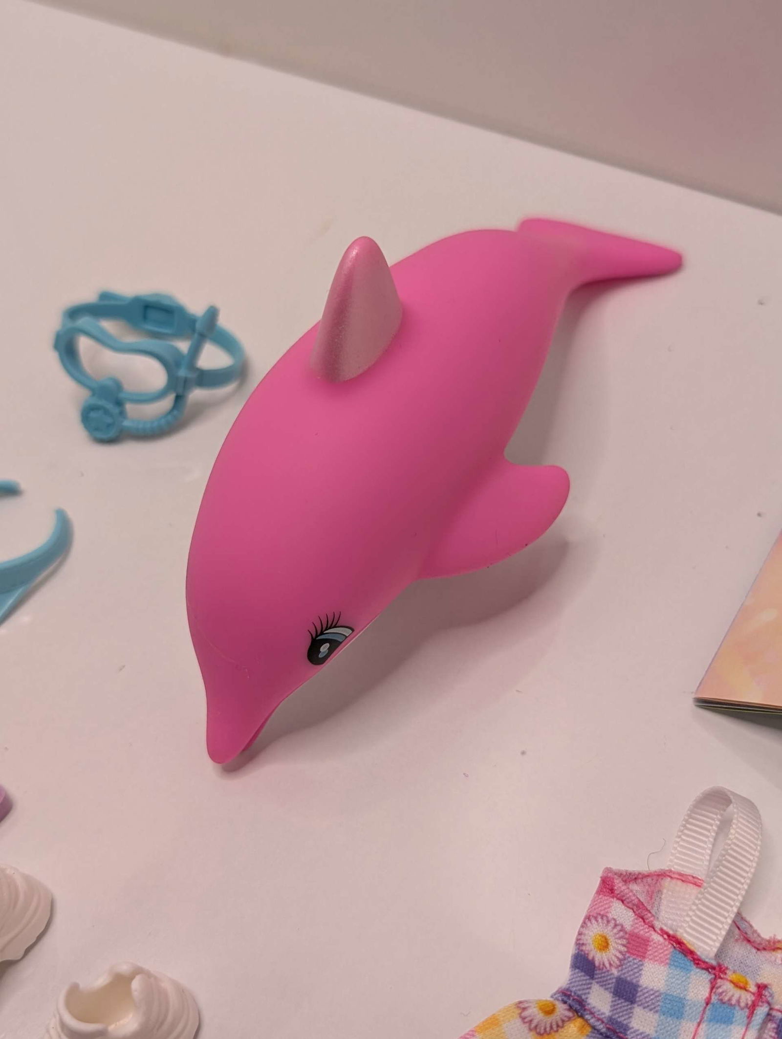 Odkryj podwodny świat z Steffi, wyposażoną w strój do nurkowania, niebieskie płetwy i okulary. Towarzyszy jej uroczy różowy delfin, którego błyszczące płetwy dodają blasku każdej zabawie.