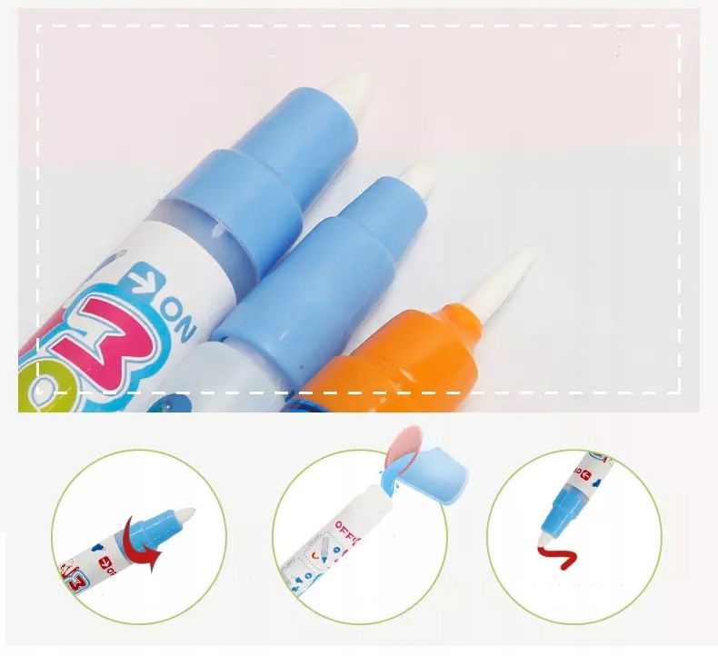 KOLOROWA, NIEKOŃCZĄCA SIĘ ZABAWA – magiczne pisaki można napełniać wodą wielokrotnie; po wyschnięciu, mata ponownie nadaje się do zabawy; żywe kolory przyciągają uwagę dziecka i zachęcają do malowania; mata ma starannie wykończone brzegi oraz posiada ciekawe nadruki; pozwala tworzyć rysunki w kolorach tęczy.