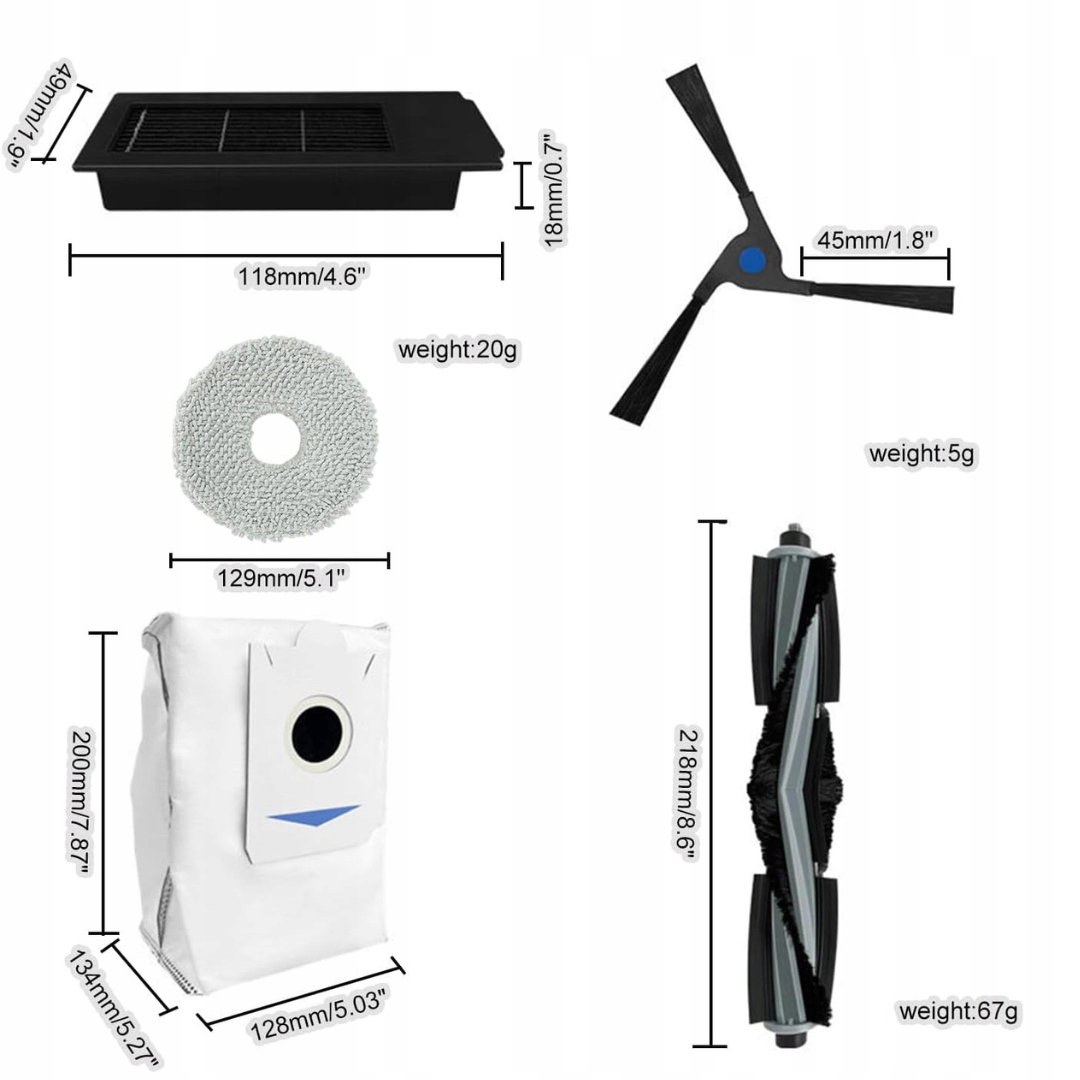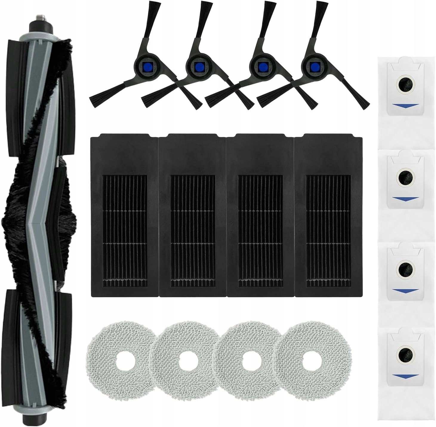 - Zawartość zestawu: 1 szczotka główna, 4 szczotki boczne, 4 filtry HEPA, 4 ściereczki nadające się do prania oraz 4 worki do odkurzacza. Zestaw umożliwia kompleksową konserwację i utrzymanie odkurzacza w pełnej sprawności przez dłuższy czas