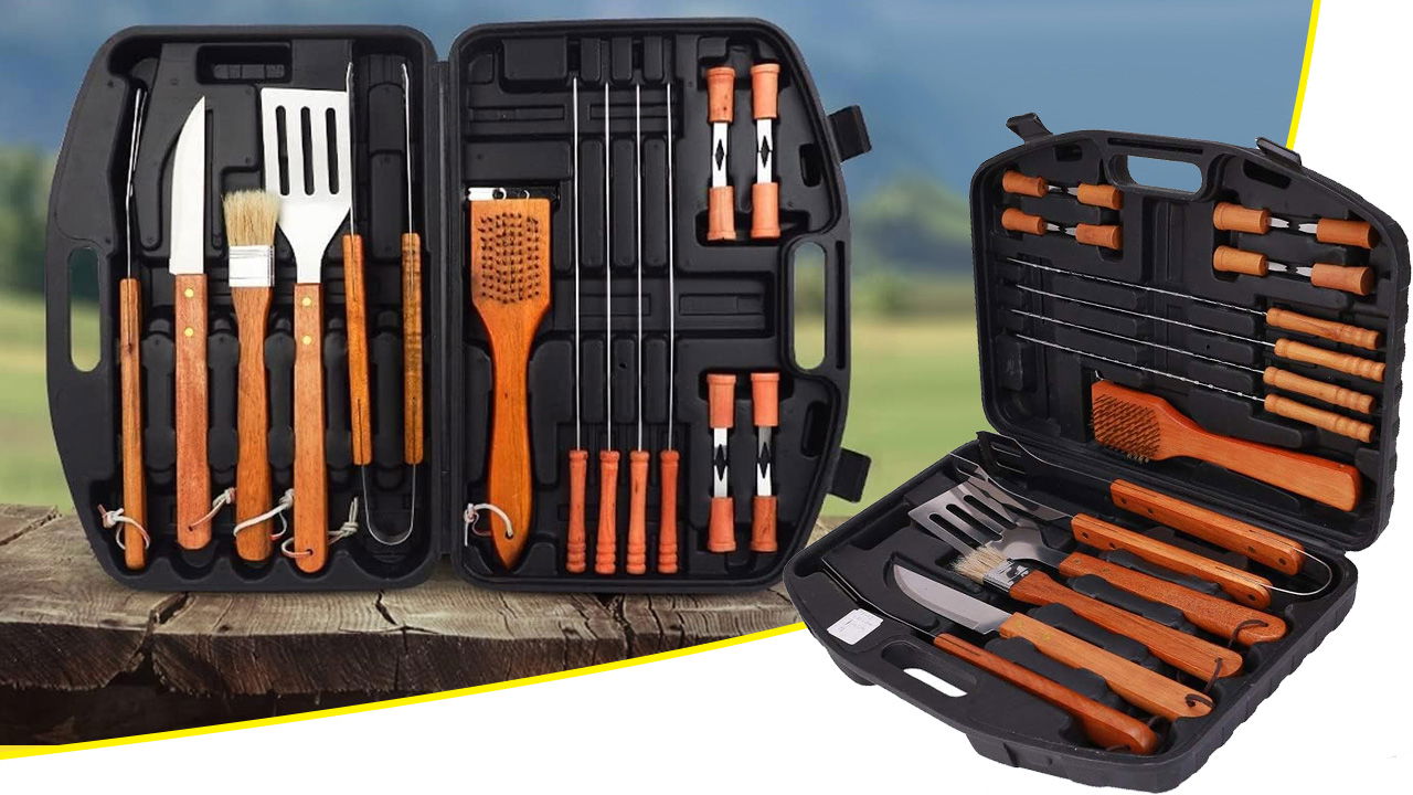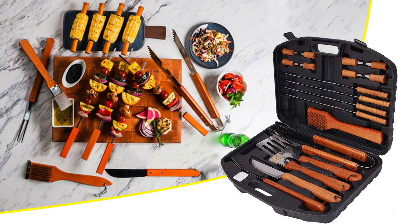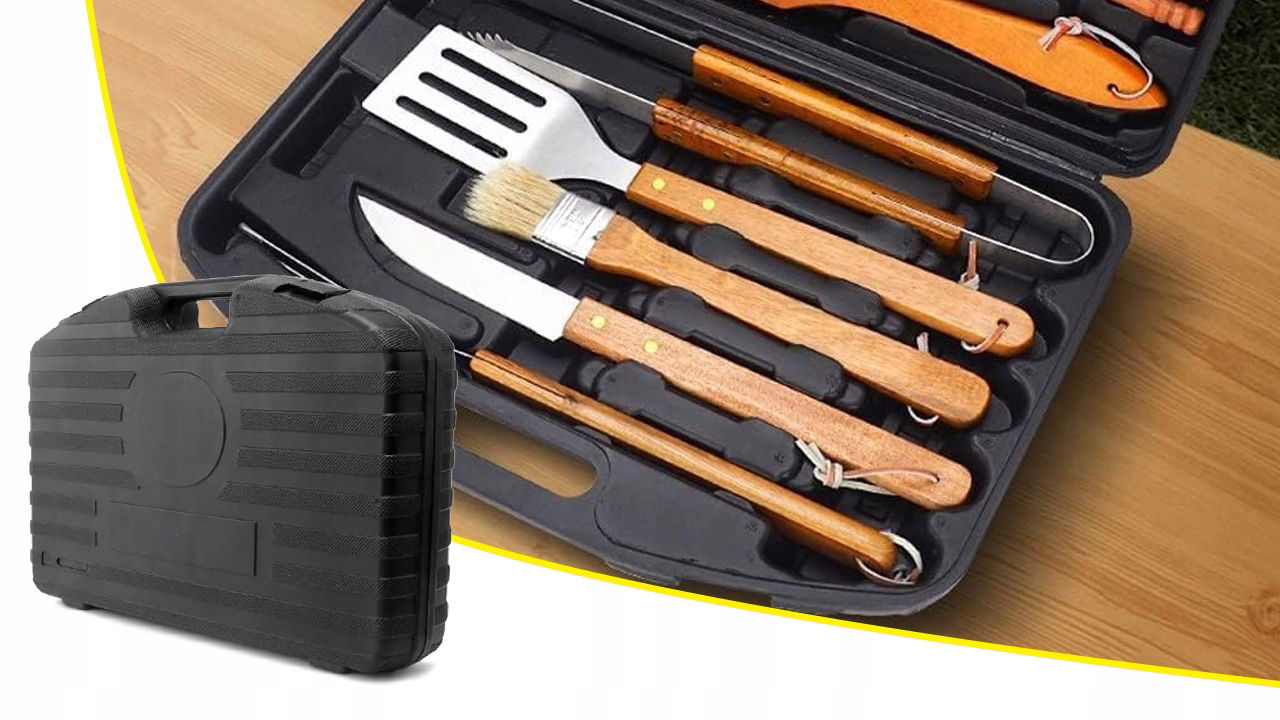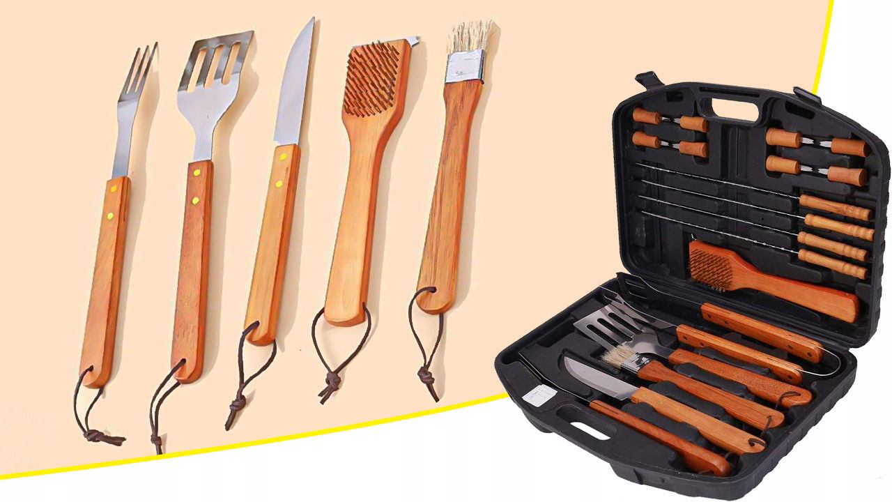 ➡️W skład zestawu wchodzą wszystkie niezbędne akcesoria, które pomogą Ci przygotować zarówno klasyczne grillowane potrawy, jak i bardziej wyszukane dania. Łopatka, szczypce, nóż, widelec – każdy element został zaprojektowany z myślą o wygodzie i funkcjonalności.