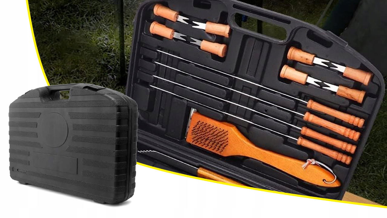 Dołączona do zestawu wytrzymała walizka wykonana z solidnego tworzywa pozwala na łatwe przechowywanie i transport narzędzi. Każdy element ma swoje dedykowane miejsce, co zapobiega przemieszczaniu się i uszkodzeniom w trakcie transportu. Dzięki temu zestaw pozostaje w nienagannym stanie, gotowy do użycia w każdej chwili. Kompaktowy rozmiar walizki sprawia, że bez problemu zmieści się ona w bagażniku, plecaku czy schowku w altanie. To idealne rozwiązanie na biwaki, pikniki i wyjazdy na kemping.