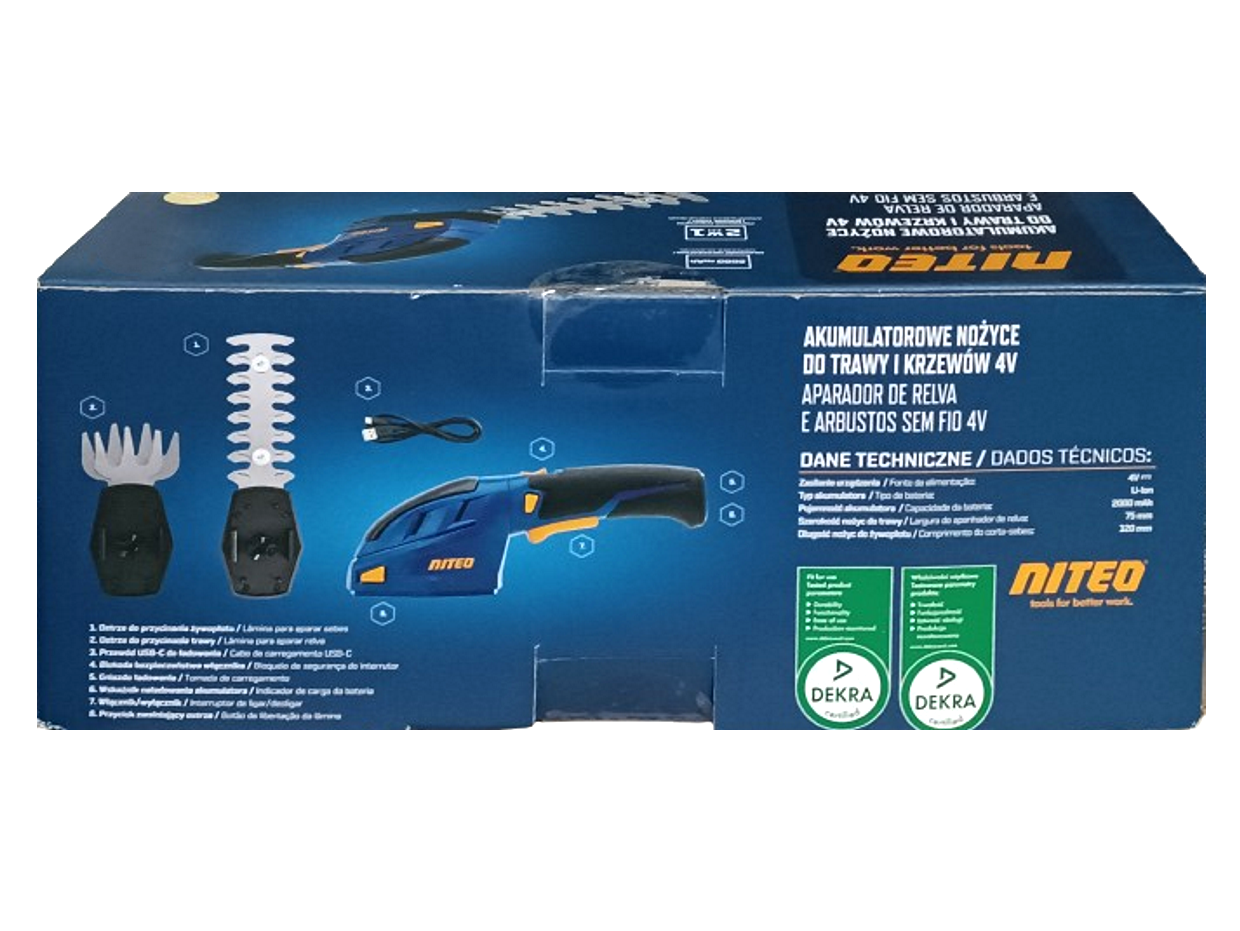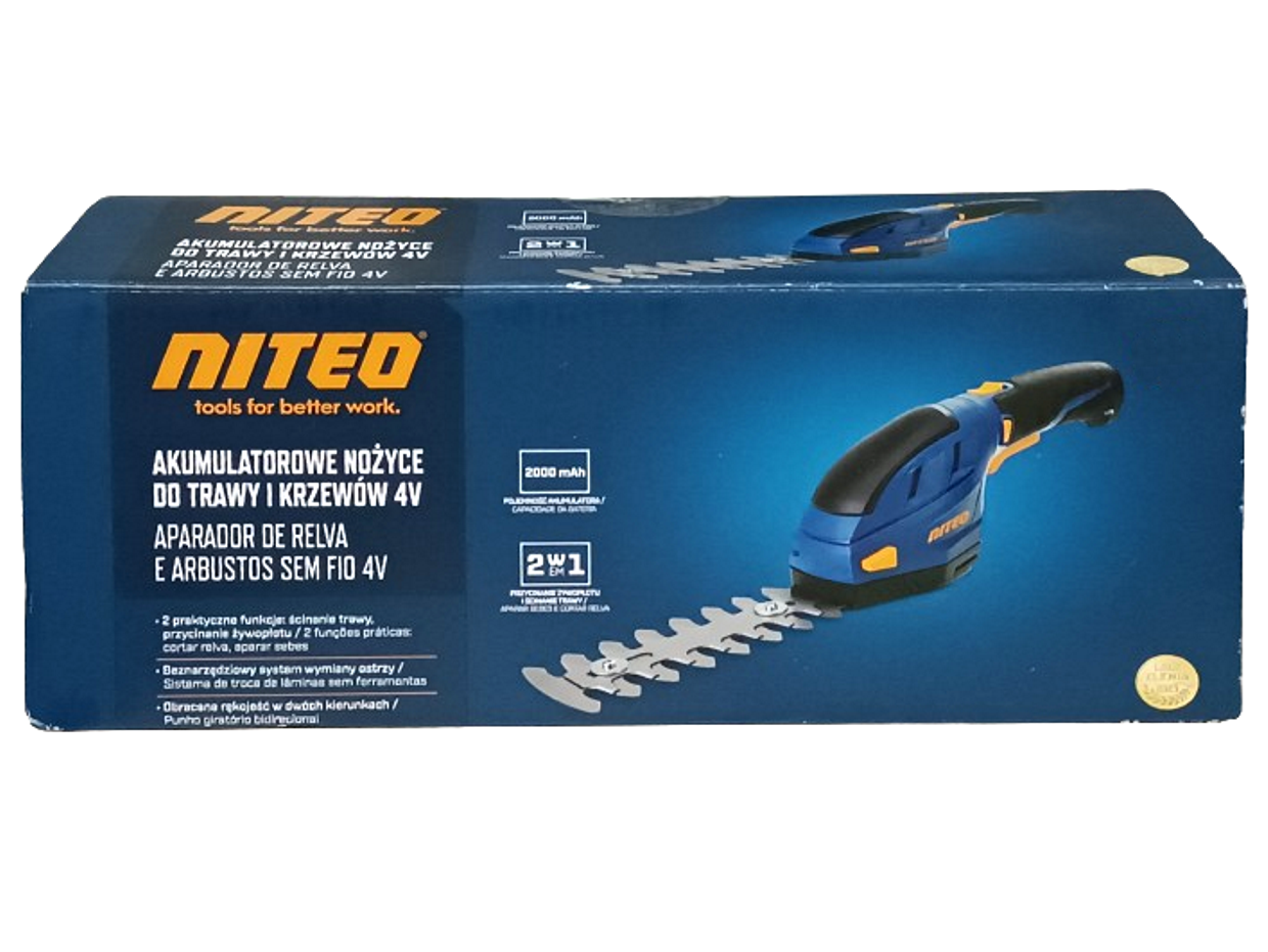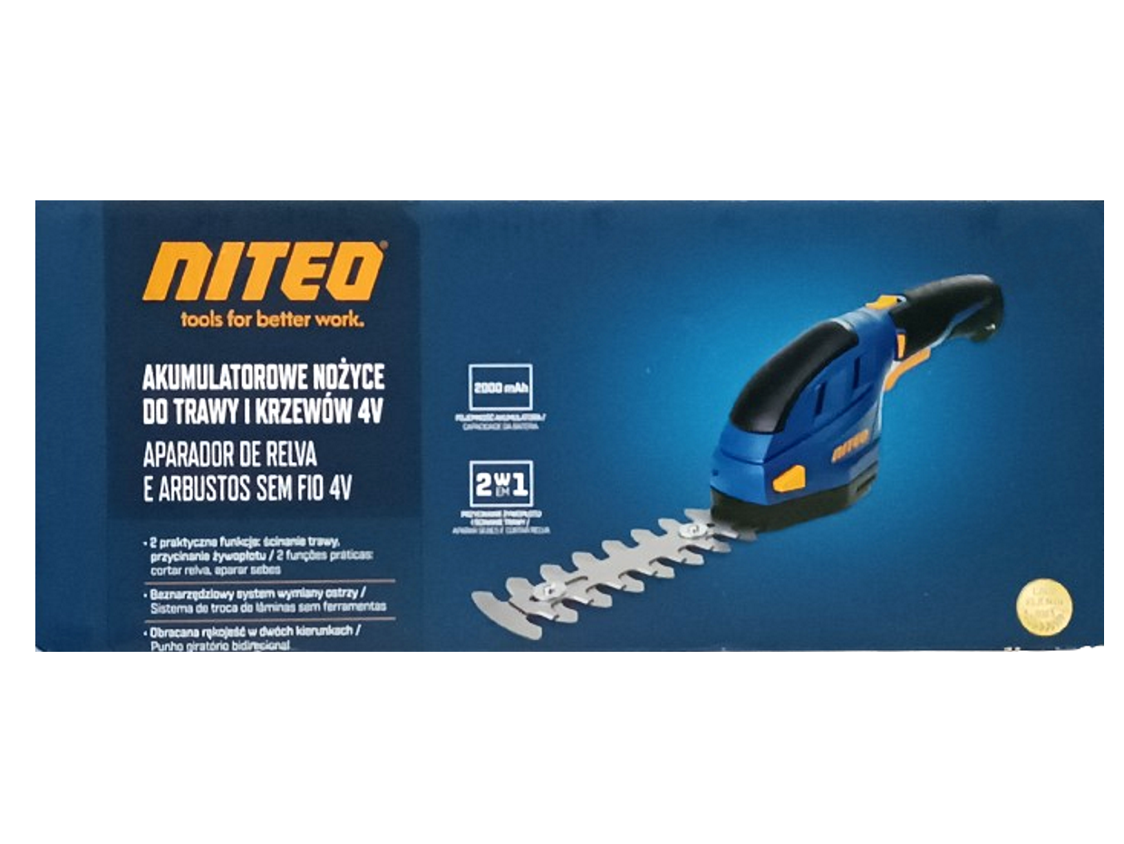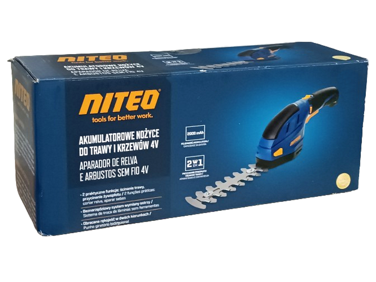 Akumulatorowa podkaszarka - nożyce do żywopłotu 2w1 marki Niteo, które umożliwiają pielęgnacje żywopłotów, traw na obrzeżach trawnika oraz w miejscach trudno dostępnych. Oferowane przez nas urządzenie wyposażone jest w akumulator litowo-jonowy 3,6V o pojemności 2000mAh. Urządzenie jest wyposażone w bez narzędziowy system wymiany ostrzy. W skład zestawu wchodzą dwa rodzaje ostrzy: jedne do przycinania żywopłotu o długości 120mm, zaś drugie do przycinania trawy o szerokości cięcia 75mm. Ponadto urządzenie posiada ergonomiczny gumowany uchwyt, zwiększający bezpieczeństwo i komfort pracy oraz blokadę bezpieczeństwa włącznika chroniącą przed przypadkowym uruchomieniem urządzenia. Urządzenie jest przeznaczone do prywatnego użytku w ogrodzie.