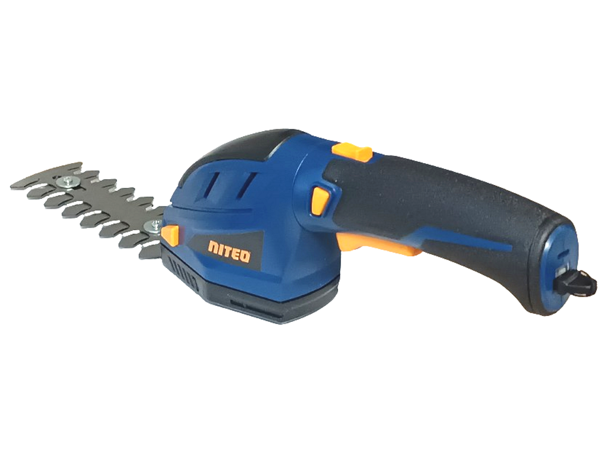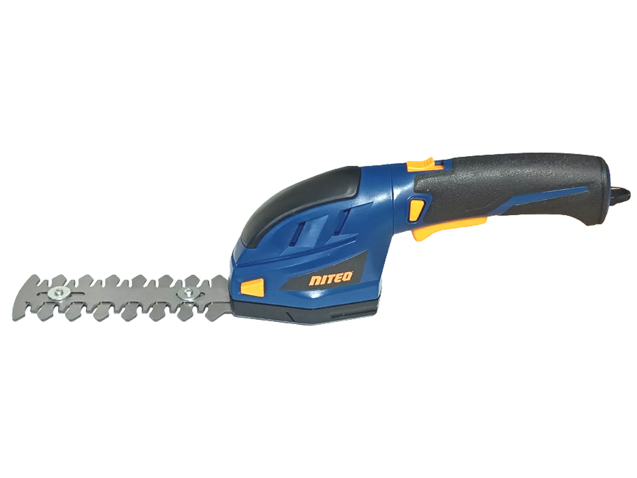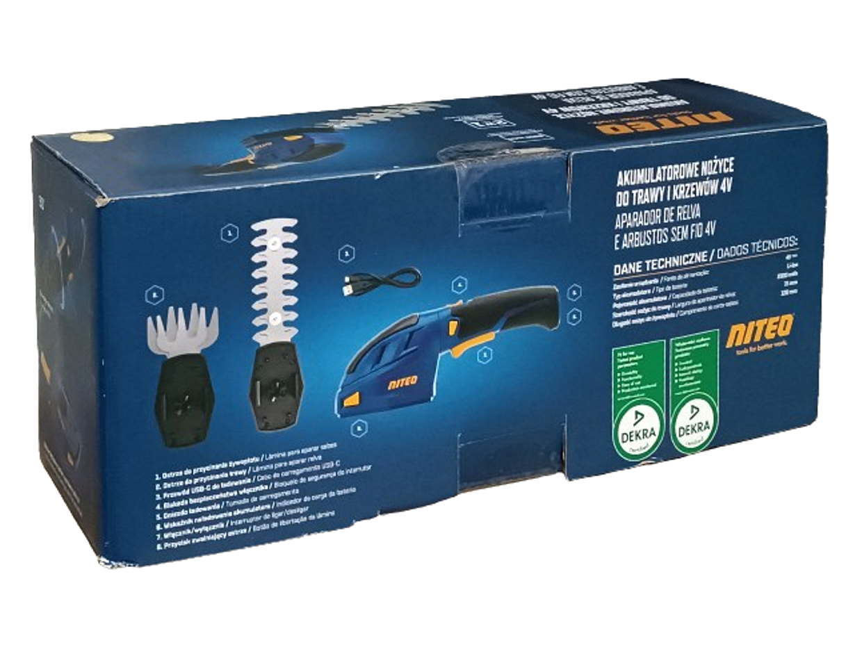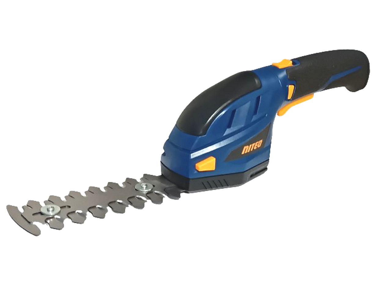 Akumulatorowa podkaszarka - nożyce do żywopłotu 2w1 marki Niteo, które umożliwiają pielęgnacje żywopłotów, traw na obrzeżach trawnika oraz w miejscach trudno dostępnych. Oferowane przez nas urządzenie wyposażone jest w akumulator litowo-jonowy 3,6V o pojemności 2000mAh. Urządzenie jest wyposażone w bez narzędziowy system wymiany ostrzy. W skład zestawu wchodzą dwa rodzaje ostrzy: jedne do przycinania żywopłotu o długości 120mm, zaś drugie do przycinania trawy o szerokości cięcia 75mm. Ponadto urządzenie posiada ergonomiczny gumowany uchwyt, zwiększający bezpieczeństwo i komfort pracy oraz blokadę bezpieczeństwa włącznika chroniącą przed przypadkowym uruchomieniem urządzenia. Urządzenie jest przeznaczone do prywatnego użytku w ogrodzie.
