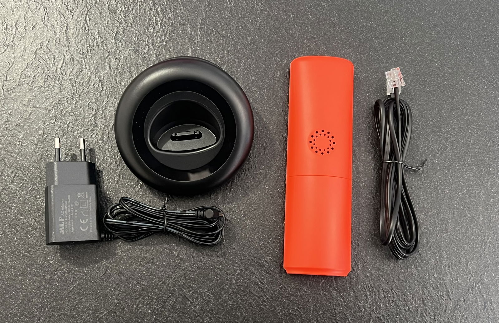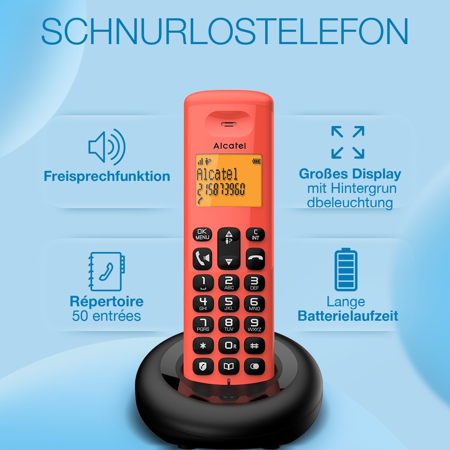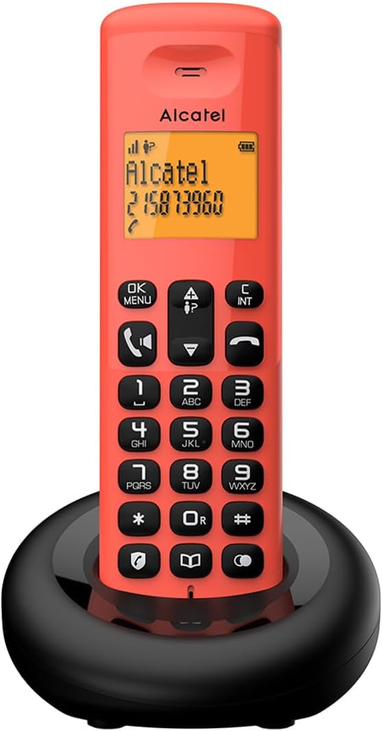ALCATEL E260 – Telefon bezprzewodowy DECT – Kompaktowa konstrukcja – Duży podświetlany wyświetlacz – Tryb głośnomówiący – Czerwony
