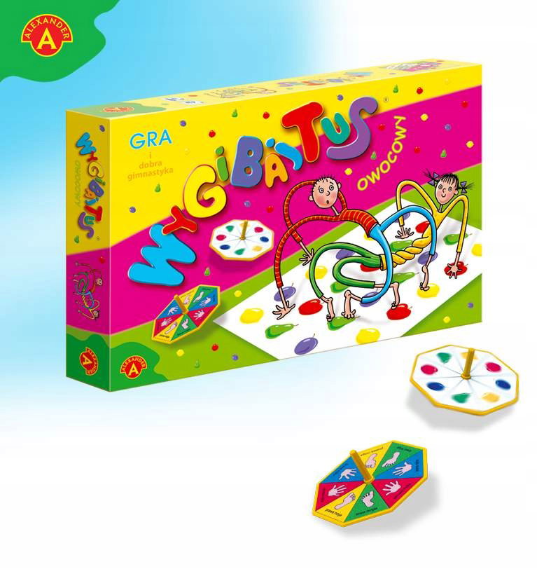 Wygibajtus owocowy to gra, w której każdy z graczy gra całym ciałem. W zależności od wskazań na tarczy baczków gracze muszą postawić swoje stopy i dłonie w odpowiednich miejscach na planszy. Gracz, który nie może zająć na planszy wskazanego miejsca odpada. Wygrywa ten, kto szczęśliwie losował i był najbardziej wygimnastykowany. Gra jest doskonałą rozrywką dla dzieci i dorosłych, zapewnia wiele emocji i dobrej gimnastyki.Zawartość opakowania:2 bączki, plansza z foli, instrukcja.Wiek graczy od: 6 latLiczba graczy: 3-6