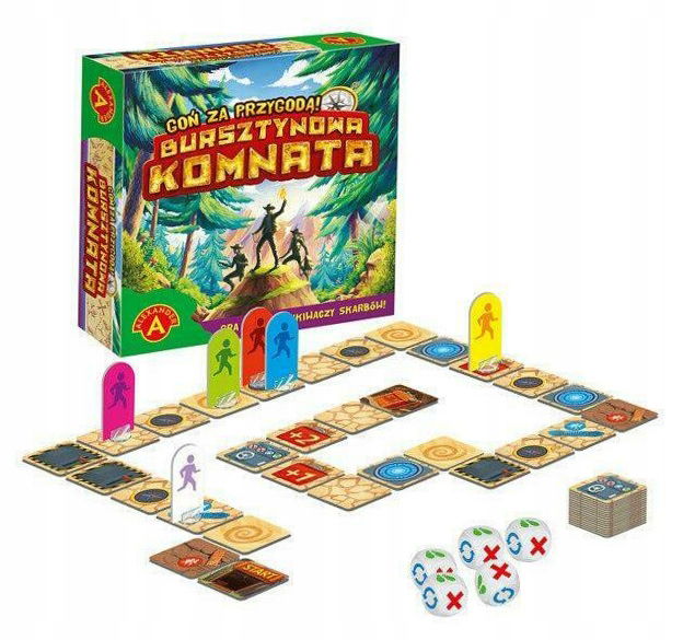 Dzieci uwielbiają przygody i tajemnice. Któż z nas nie bawił się w podróżników, odkrywców czy wreszcie poszukiwaczy skarbów.I tym właśnie jest gra Bursztynowa Komnata- wspaniałą wyprawą w nieznane, gdzie na końcu czeka na nas mechanika i niespodziewane zwroty akcji zapewnią wspaniałą rozrywkę dla całej wyróżnia grę:Gra planszowa bez planszy, a może raczej z planszą, którą budujemy sami. Dysponujemy 40 planszetkami z których układamy tak zwaną ścieżkę. Sami decydujemy, czy chcemy, żeby rozgrywka była dłuższa i używamy wszystkich planszetek, czy też krótsza i wykorzystujemy tylko część z nich. W budowaniu ścieżki ważne są tylko 2 zasady: musi zaczynać się od planszetki z napisem STRAT i kończyć na planszetce z napisem TOP wszystkim nietuzinkowa, dynamiczna mechanika. To jak wygląda miejsce rozgrywki na początku zabawy ma się nijak do tego, co stanie się nim na końcu, ponieważ po każdym opuszczeniu planszetki odwracamy ją na drugą stronę.Nie jest to bezwolna gra losowa, mamy wpływ na to jak się poruszamy. Możemy podejmować ryzyko i nie zawsze musimy wykonywać ruchy wskazane przez rzut kośćmi. W grze możemy postawić na kooperację lub rywalizację, w zależności od wybranej każdym kroku czeka na nas przygoda, a o tym co dzieje się z trasą rozgrywki oraz akcją decyduje to, na jakich polach staną gracze. Cóż wiec może się nam przydarzyć? - ruchome piaski, zapadnia, teleport, czy pułapka, a której uwolni nas jedynie ułożenie odpowiedniego szyfru oraz wiele innych ten kto pierwszy dotrze do ostatniej planszetki i odnajdzie ukrytą Bursztynową Komnatę.Zawartość opakowania:planszetki - 40 szt.,kości losu - 5 szt.,pionki tekturowe - 6 szt.,podstawki do pionków - 6 szt.,klepsydra - 1 szt.,instrukcja.
