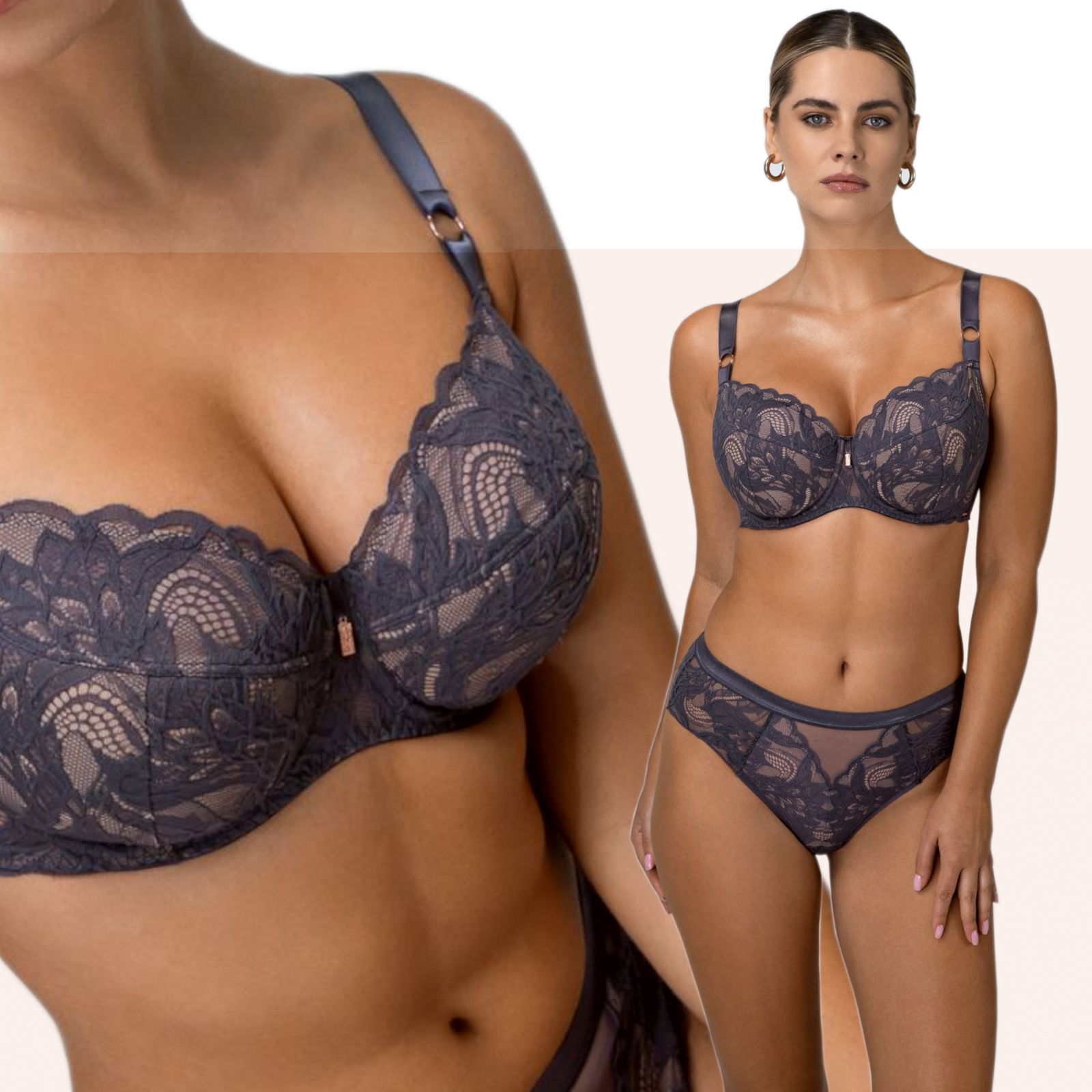 Efekt: podparcie i doskonała stabilizacja średniego i dużego biustu / krągły kształt piersi / percepcja barwy: odcień grafitu z fioletem w koronce współgra ze skórą, wydobywając jej promienność i subtelnie eksponując kształt ciała