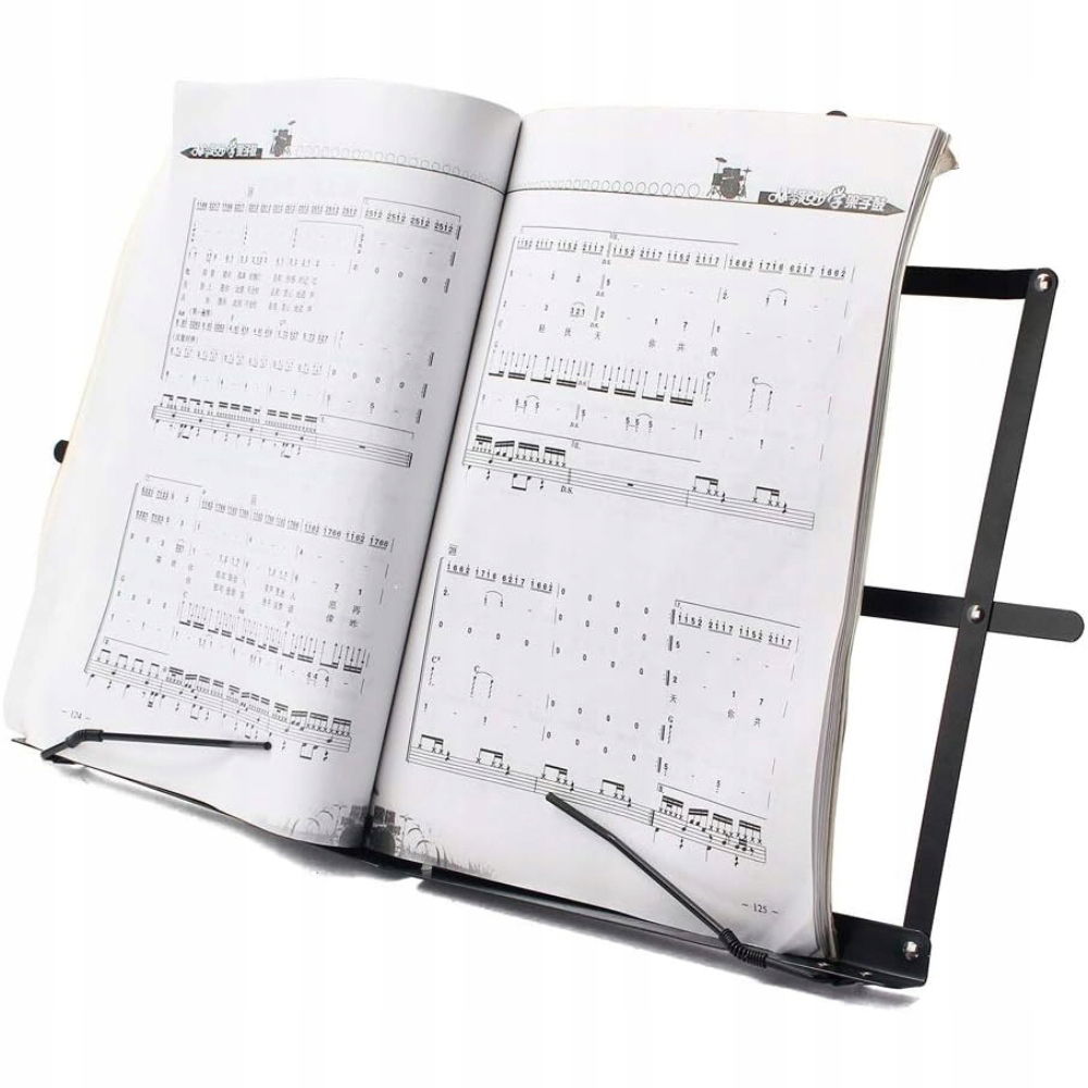 - Dodatkowe funkcje:Sprężynowe uchwyty do przytrzymywania kartekMożliwość użycia jako podstawka na książki, nuty, tabletUniwersalne zastosowanie – do domu, sali prób, szkoły muzycznej