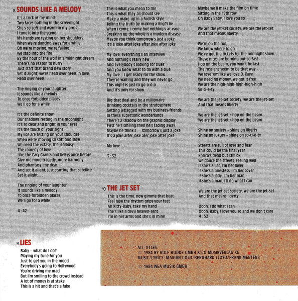 A Warner Communications Company.Wyprodukowano w Niemczech przez Record Service GmbH. Alsdorf.Prawa autorskie do nagrań dźwiękowych – WEA Musik GmbHOpublikowane przez – Rolf Budde MusicNagrano w – Studio 54, BerlinNagrano w – Weryton StudiosMixed At – Studio 54, BerlinMastering odbył się w Tonstudio Ulrich Kraus