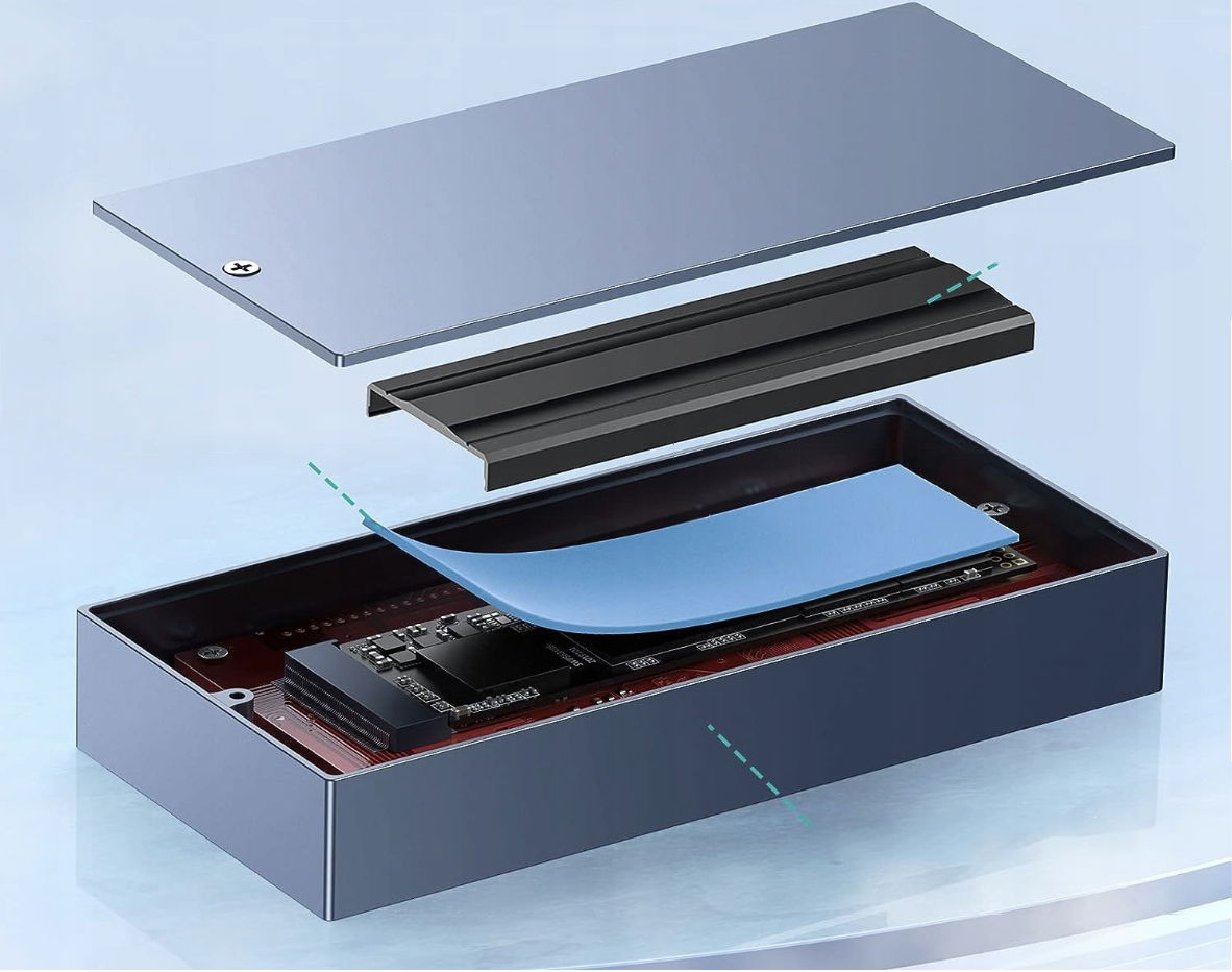 Obudowa dysku M2 ma całkowicie aluminiowy korpus i zintegrowaną aluminiową kamizelkę chłodzącą, co gwarantuje doskonałą wydajność chłodzenia.