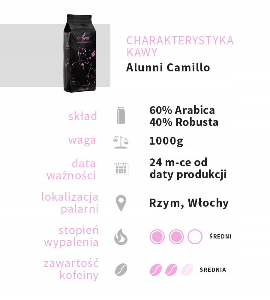 Kawa Alunni Camillo idealnie nada się do Twojego ekspresu automatycznego, ekspresu kolbowego, a po odpowiednim zmieleniu świetnie odnajdzie się w kawiarce oraz frenchpressie