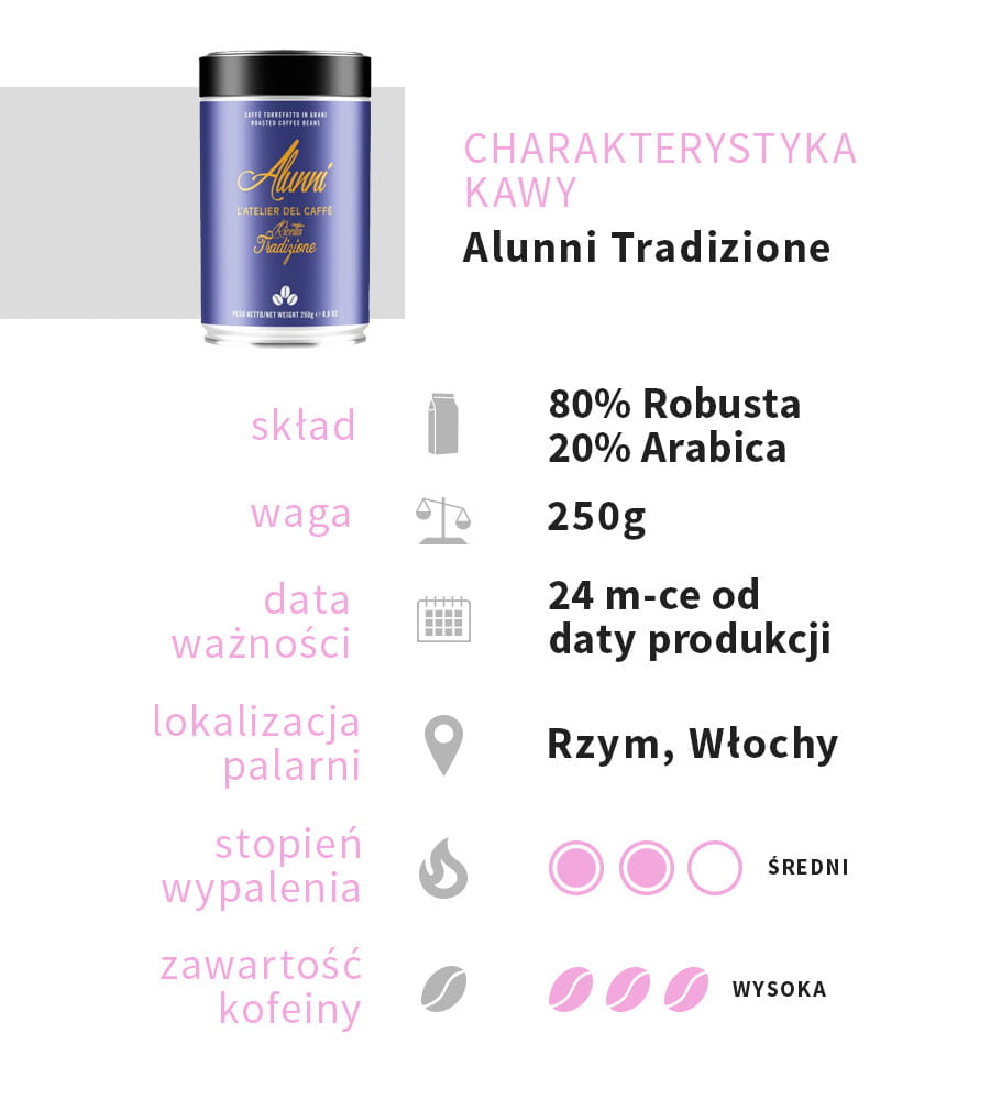 Dlaczego warto wybrać Alunni Tradizione?Alunni Tradizione to kawa, która dostarcza energii i głębi smaku w każdej filiżance. Dzięki wyjątkowej mieszance Robusty i Arabiki jest idealna na poranne espresso oraz klasyczną kawę czarną. Niska kwasowość sprawia, że jest idealnym wyborem dla tych, którzy cenią mocny, zrównoważony smak.