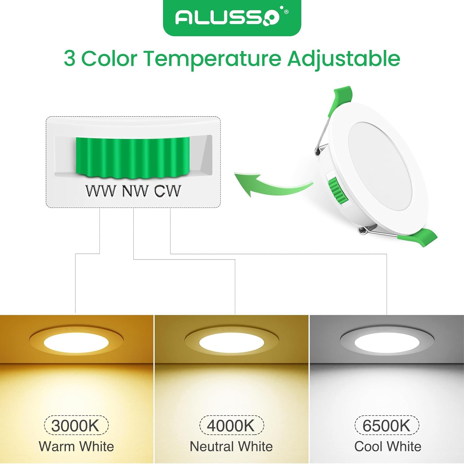 - CCT – 3 temperatury barwowe do wyboru - nowe wzornictwo, reflektory LED do zabudowy można ustawić na ciepłą biel (3000 K) lub neutralną biel (4000 K) lub zimną biel (6500 K), aby spełnić Twoje wymagania. Wystarczy wybrać kolor oświetlenia, który najlepiej pasuje do Twojego domu za pomocą zielonego przełącznika uchylnego. Przed instalacją należy wybrać żądany kolor oświetlenia.