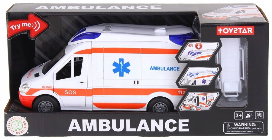 Karetka pogotowia ratunkowego z napędem frykcyjnym przeznaczona jest do akcji ratunkowych. Ambulans posiada otwierane drzwi do kabiny, otwierane drzwi boczne oraz otwierany bagażnik. Wewnątrz bagażnika jest miejsce dla noszy dołączonych do zestawu. Nosze ułatwią transport poszkodowanego do szpitala. Na dachu umieszczono moduł dźwiękowo świetlny, który zapewni wiele godzin radosnej zabawy. Wystarczy włączyć syrenę i wyruszyć na akcji.