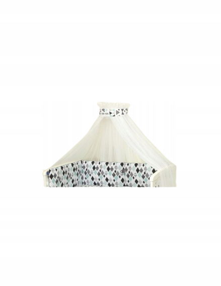 Baldachim wykonany jest z białego tiulu, dzięki czemu jest przewiewny i nie zabiera światła. Spełnia podwójną funkcję; estetyczno-ozdobną oraz funkcjonalną. Stanowi piękne wykończenie łóżeczka oraz nadaje niepowtarzalny, uroczy klimat pokoikowi dziecięcemu. Walory praktyczne baldachimu to możliwość zastosowania go jako moskitiery.