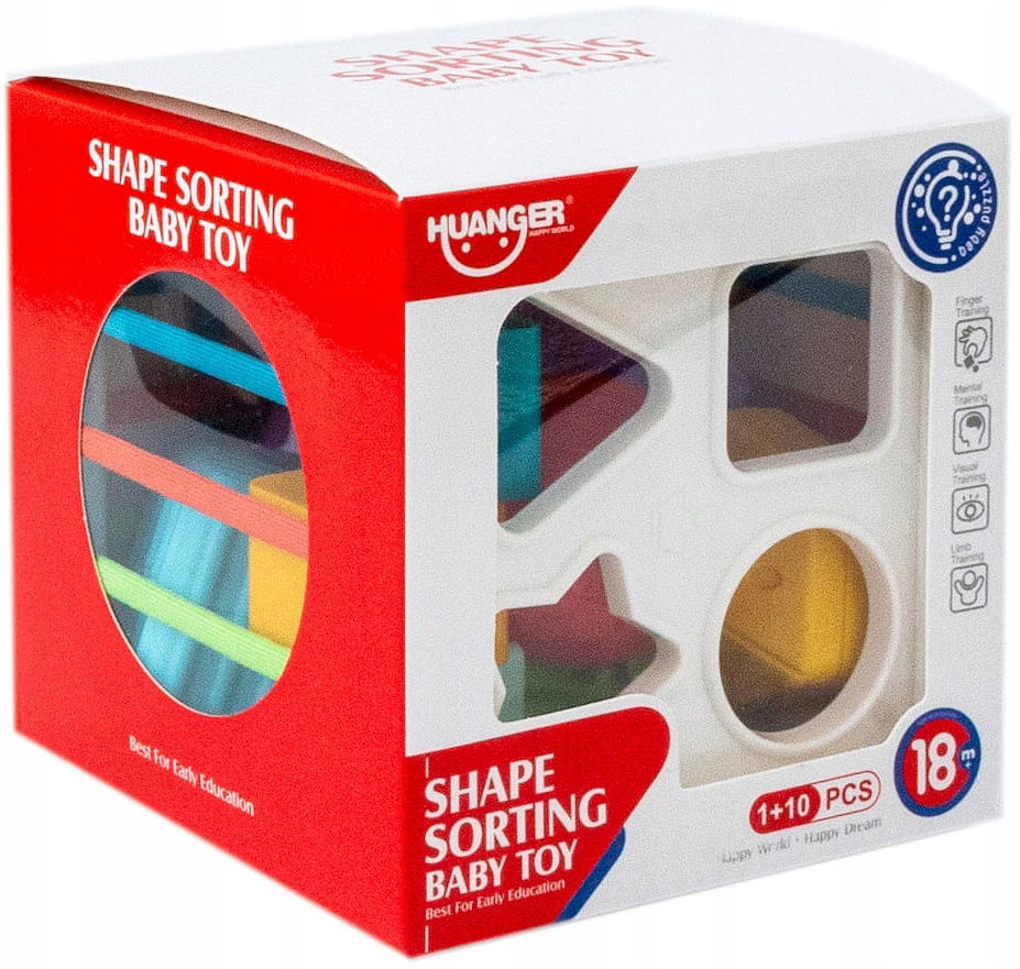 Sześć bajecznie kolorowych, o różnych formach i kształtach geometrycznych klocków, przyciąga uwagę dziecka aktywizując percepcję wzrokową, uczy rozpoznawania kształtów oraz aktywizuje zmysł dotyku i zdolności manualne. Dodatkowo sześcian, którego ścianki utkane są z kolorowych, elastycznych linek, pełni rolę sortera, do którego bez trudu można wrzucać klocki i przechowywać je tam. Ponowne wyjęcie klocków wymaga sporej koncentracji , zaangażowania malucha, uczy wytrwałości gratyfikując włożony wysiłek. Zabawka wpływa pozytywnie na emocje, zapewnia relaks i kreatywną zabawę, pomaga w nauce kolorów oraz kształtów. Zabawka wykonana z najwyższej jakości plastiku, bez ftalanów.