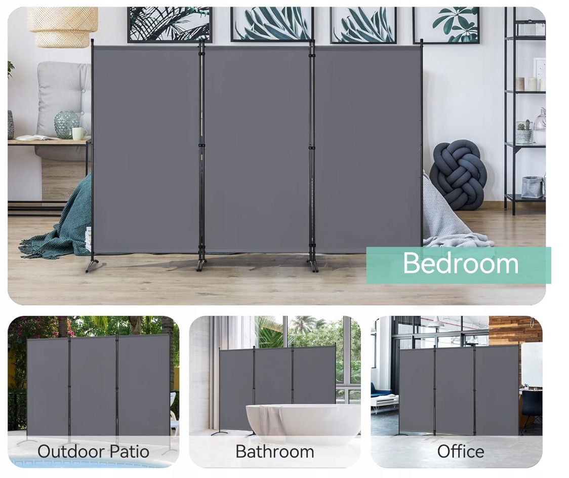 - ✴️ Składana i regulowana konstrukcja - Parawan można ustawiać pod różnymi kątami w zależności od potrzeb. Konstrukcja umożliwia obrót segmentów o 360° oraz ustawienie w różnych kształtach, np. w formie litery L lub C. Produkt nie jest przeznaczony do użytkowania przy silnym wietrze.