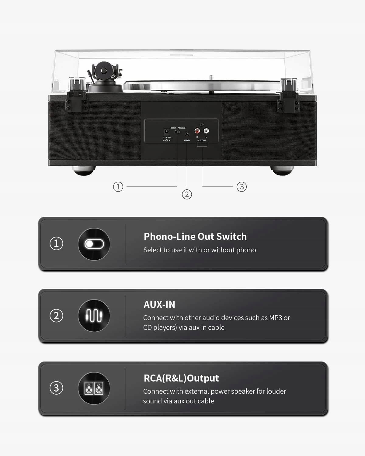 ✔️ Możliwość podłączenia zewnętrznych głośników przez wyjścia RCA (Line/Phono) – z lub bez korektora phono