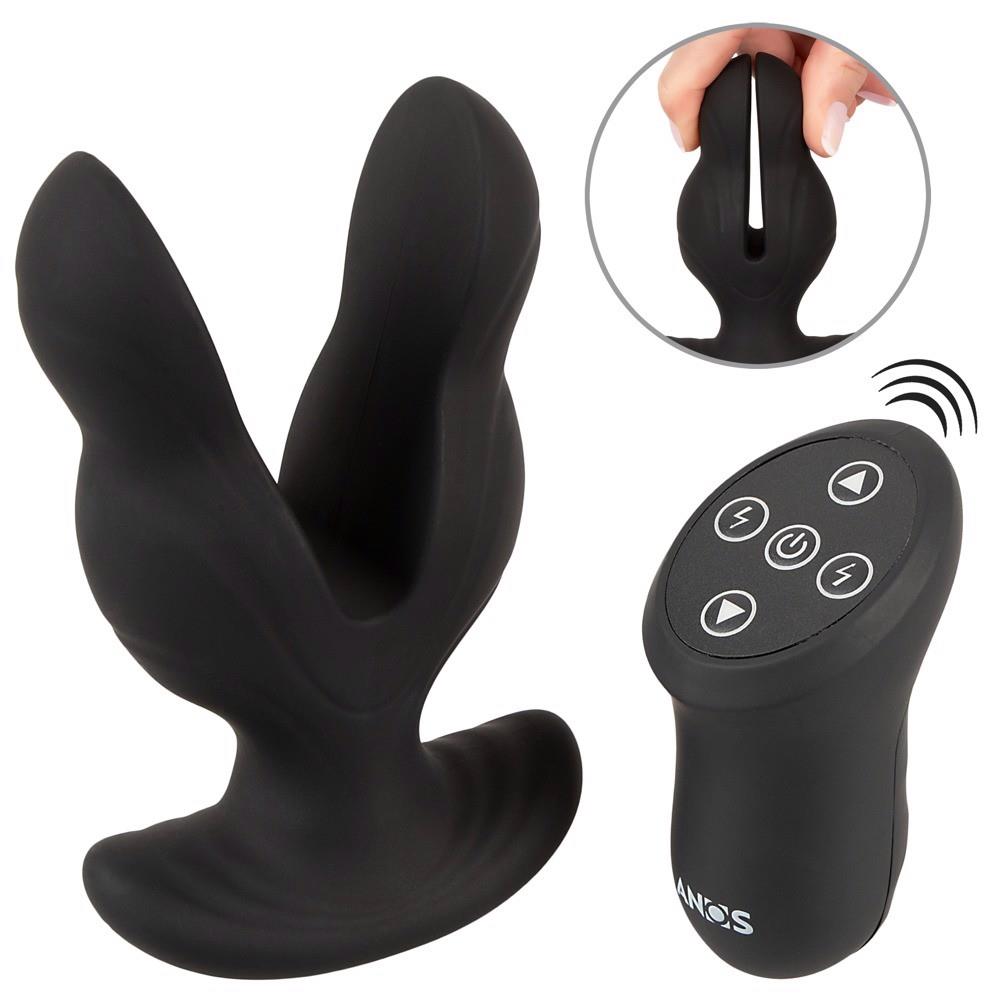 Spreads, stretches, vibrates and electrifies! The RC Power Expander Plug from ANOS has vibration and e-stimulation. For perfect backdoor stretching and intense stimulation. The tips of the fancy 2-armed plug are pressed together and then inserted. It returns to its original size once it is in the anus. 2 powerful motors provide reliable and diverse e-stim and vibro pleasure.