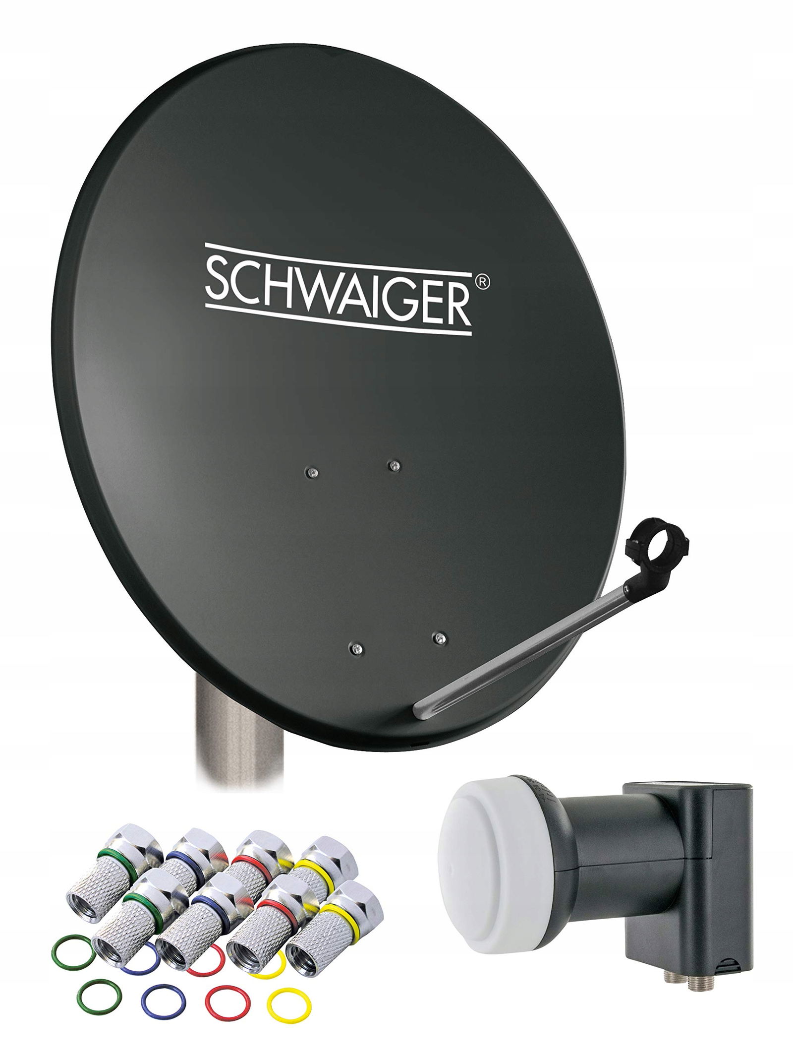 Zakres dostawy: antena stalowa offsetowa, Twin LNB, uchwyt masztu, akcesoria montażowe, 2 x 4 kolorowe wtyczki F