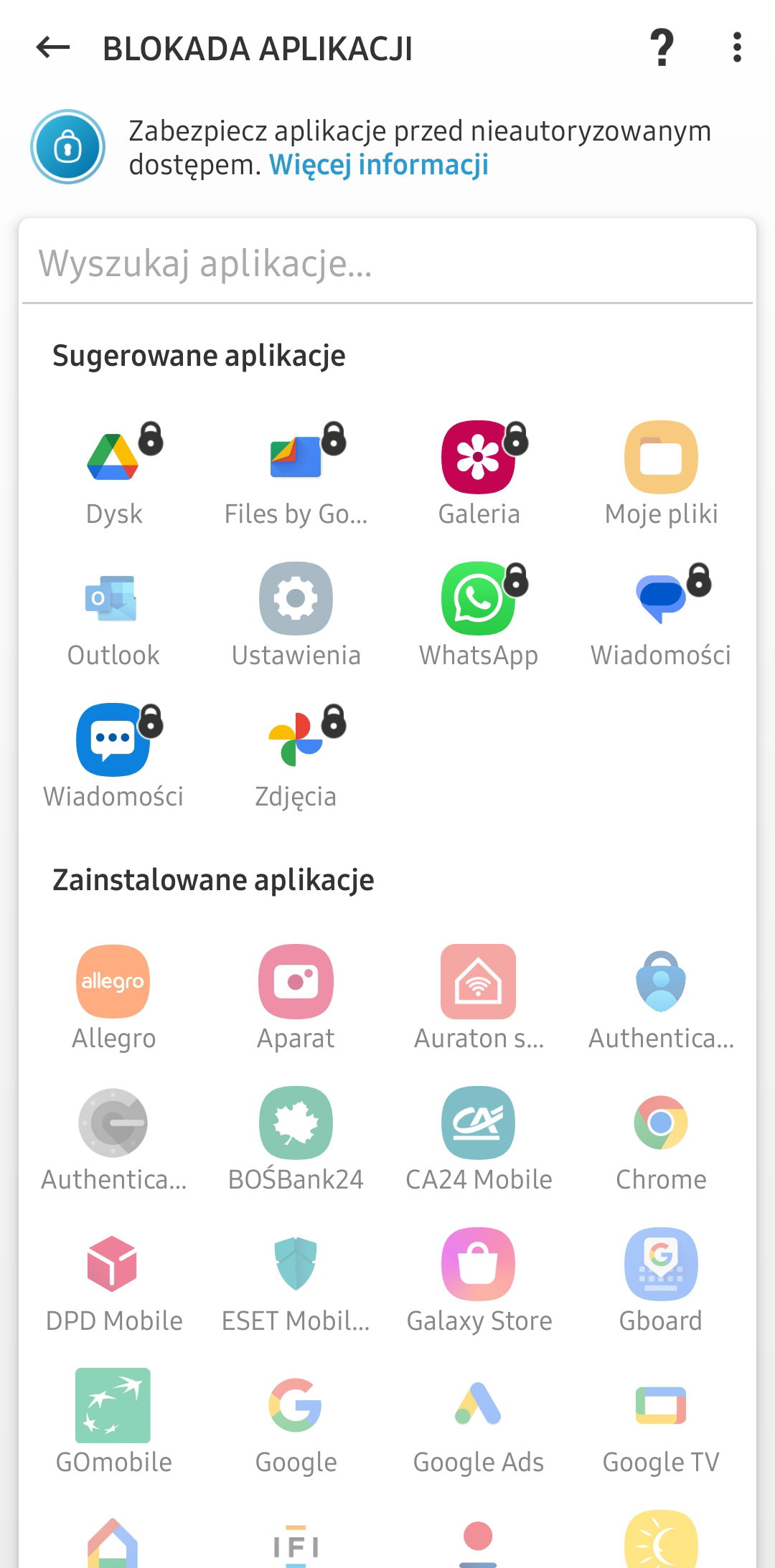 - Zabezpieczanie wybranych aplikacji hasłem lub odciskiem palca.