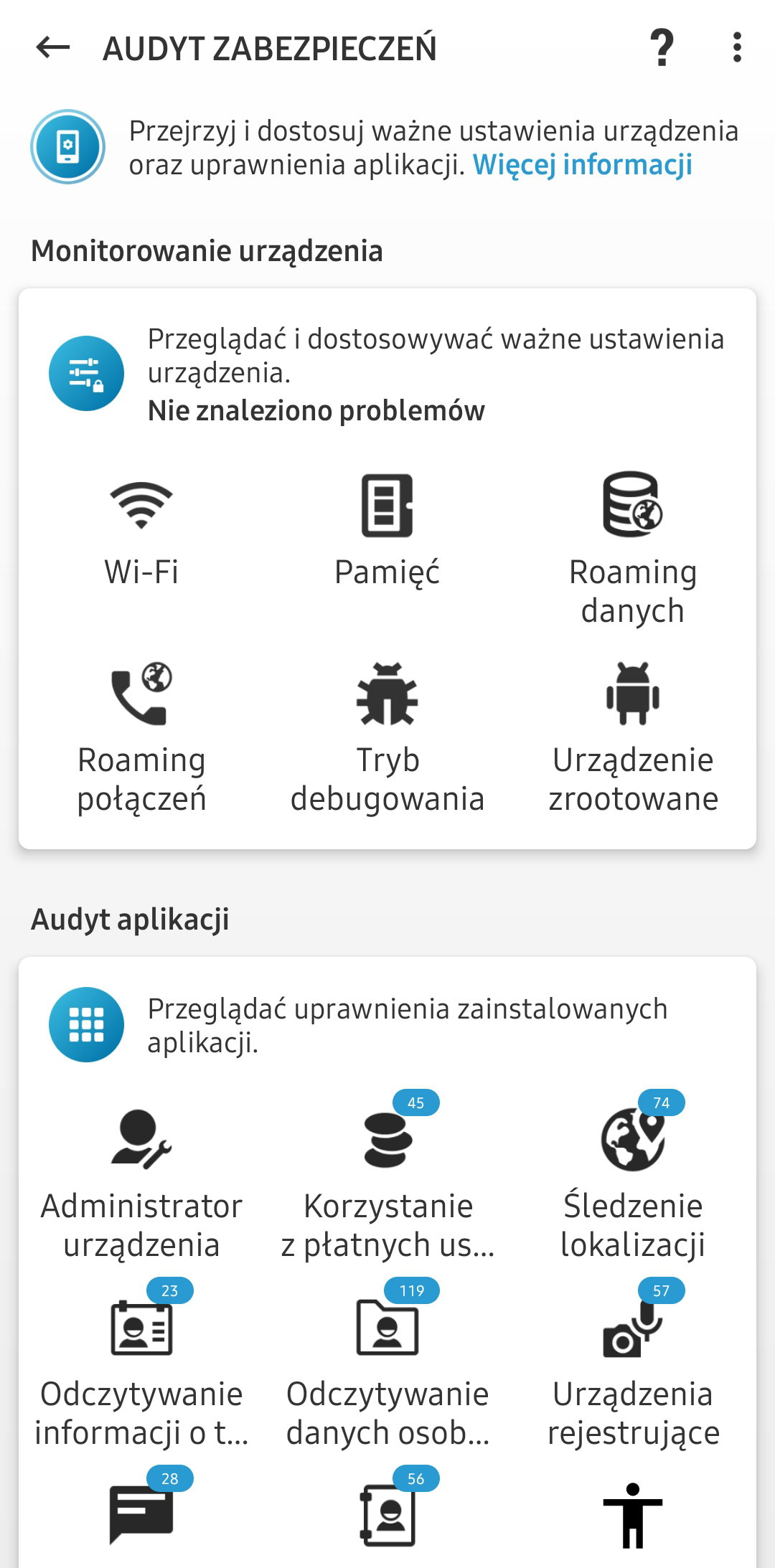 - Security Audit: Sprawdza ustawienia urządzenia i sugeruje poprawki, które mogą zwiększyć jego bezpieczeństwo.