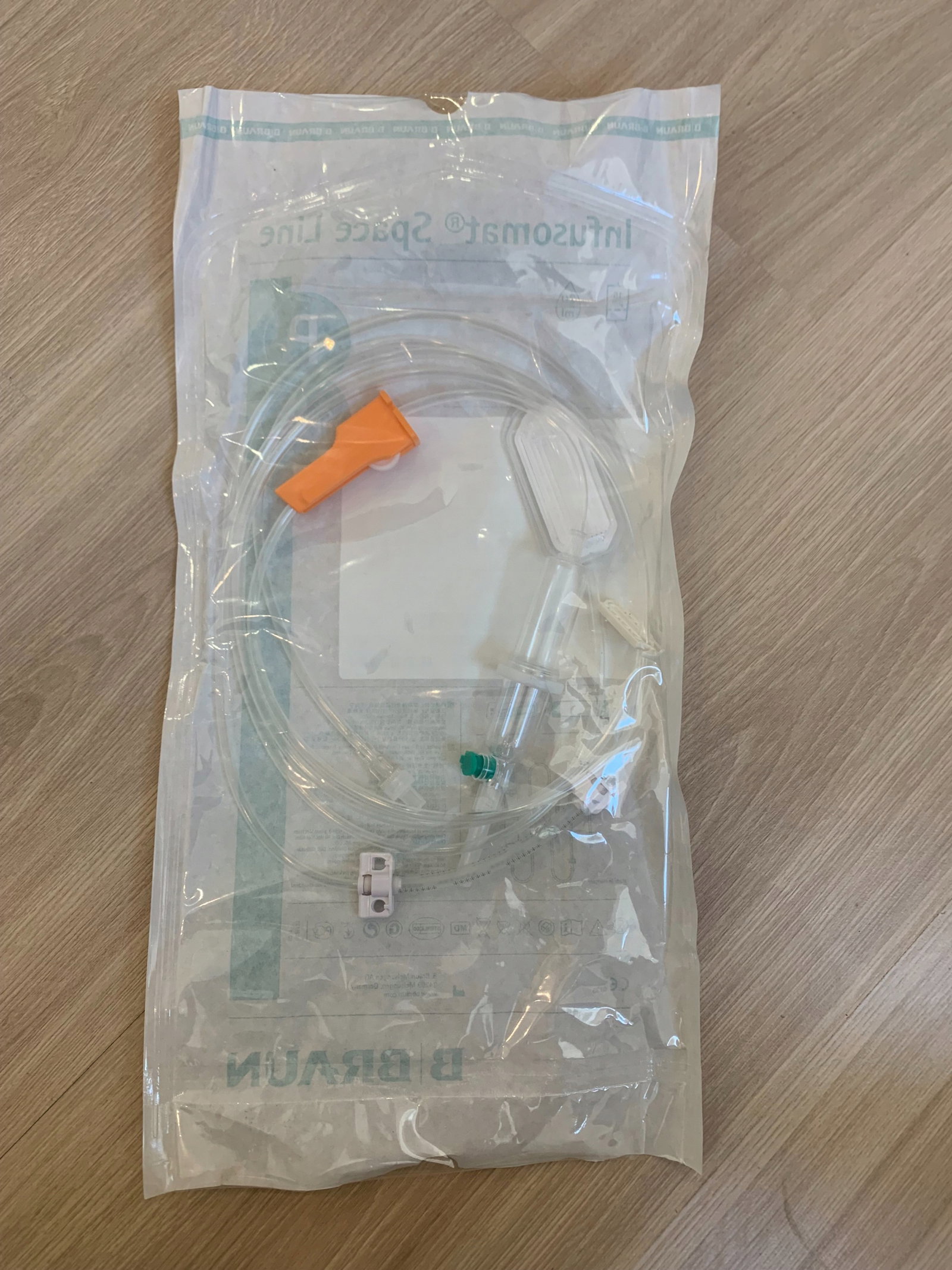 Dren do przetoczeń płynów infuzyjnych przez pompę, z filtrem i zatyczką typu Eurocap, miejsce na kolec komory kroplowej, z segmentem silikonowym do kontaktu z mechanizmem pompy - kompatybilny (współpracujący) z pompą Infusomat Space, bez zawartości ftalanów.