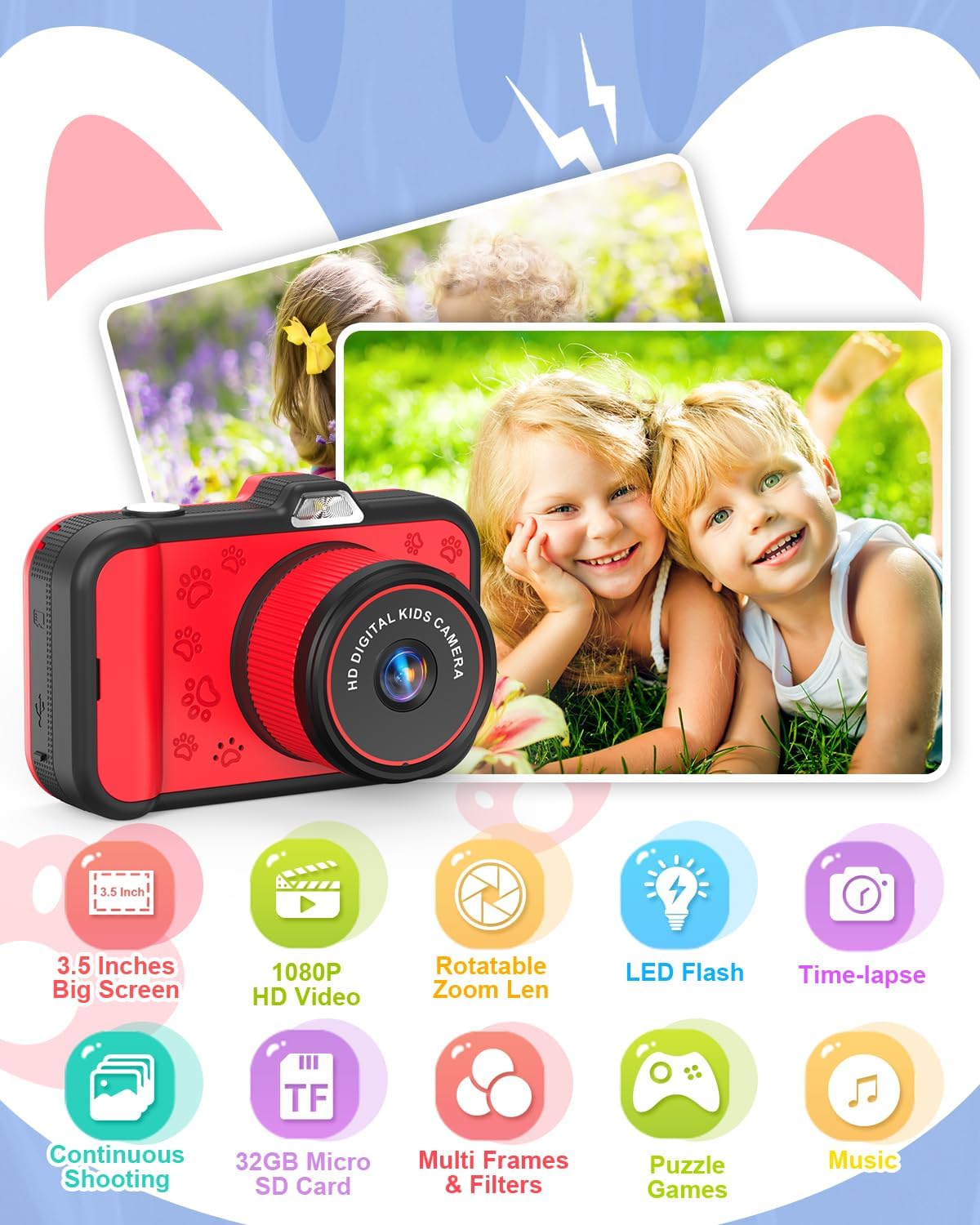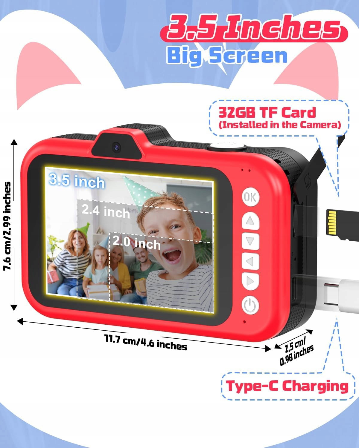 - Aparat dziecięcy z dużym ekranem o przekątnej 3,5 cala: Zupełnie nowy aparat dziecięcy z dużym ekranem o przekątnej 3,5 cala, który zapewnia lepsze kąty widzenia i szerszą gamę kolorów, dzięki czemu Twoje dzieci mogą robić ostre i wyraźne zdjęcia. Aparat lepiej promuje obserwację i kreatywność dzieci. Dzięki smyczy dzieci mogą zabrać ją ze sobą w dowolne miejsce, aby odkrywać świat i rozwijać dziecięcą ciekawość i zainteresowanie fotografią