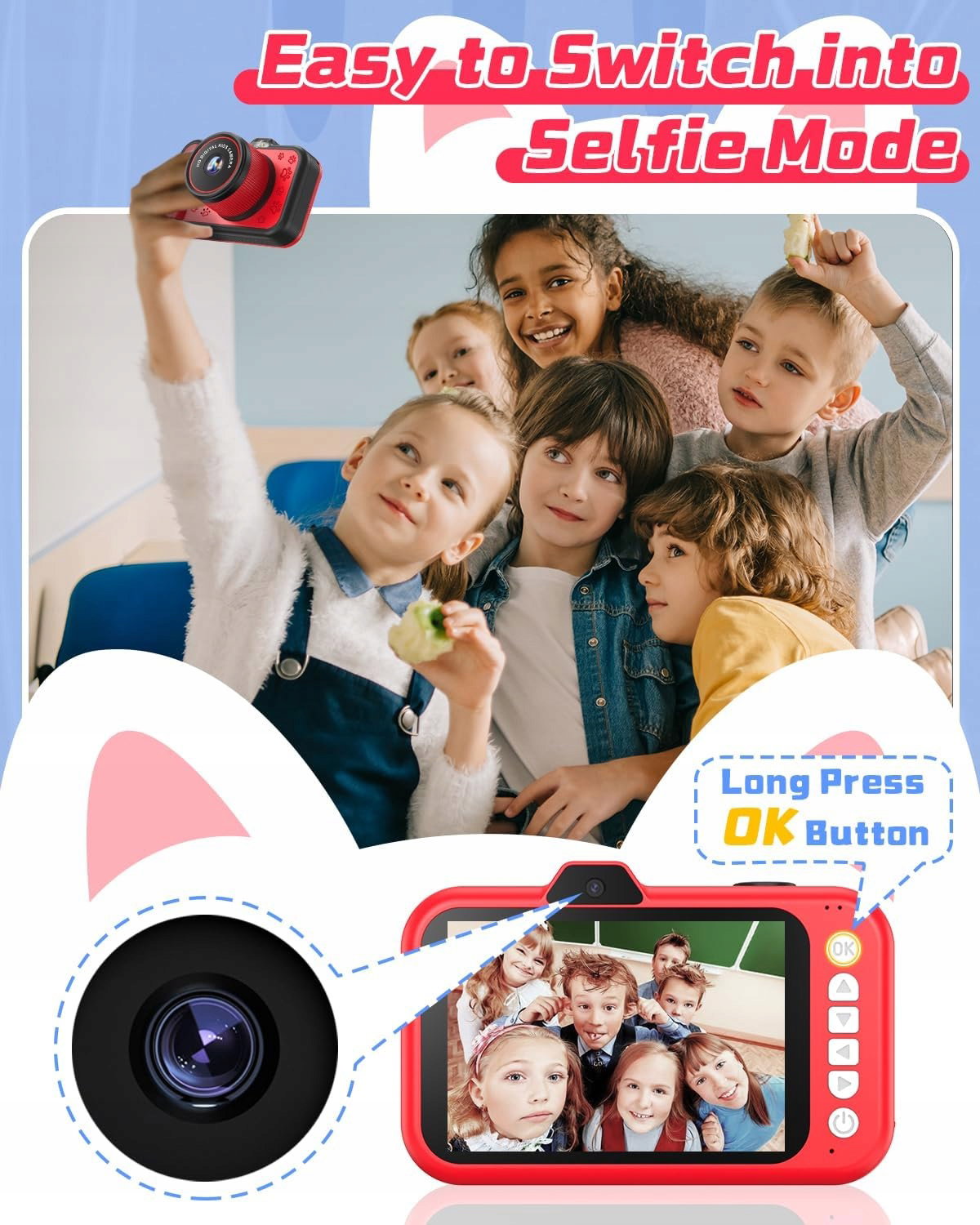 - Karta TF o pojemności 32 GB i bateria 1200 mAh: Cyfrowy aparat dla dzieci ma wbudowany akumulator litowo-jonowy o pojemności 1200 mAh i po pełnym naładowaniu zapewnia 3-4 godziny użytkowania. Jest wyposażony w kabel ładujący typu C i interfejs USB-C, dzięki czemu aparat dziecięcy jest kompatybilny z większością komputerów. Aparat jest również wyposażony w kartę TF o pojemności 32 GB, na której można zapisać około 3000 zdjęć lub setki filmów