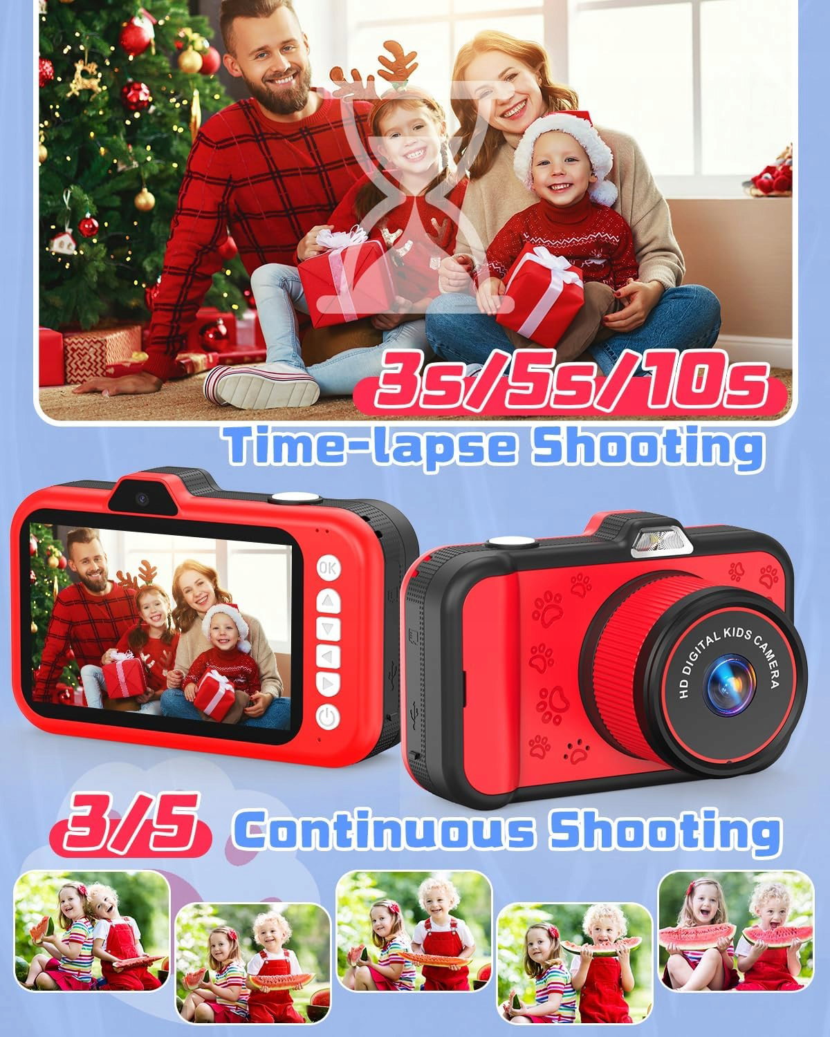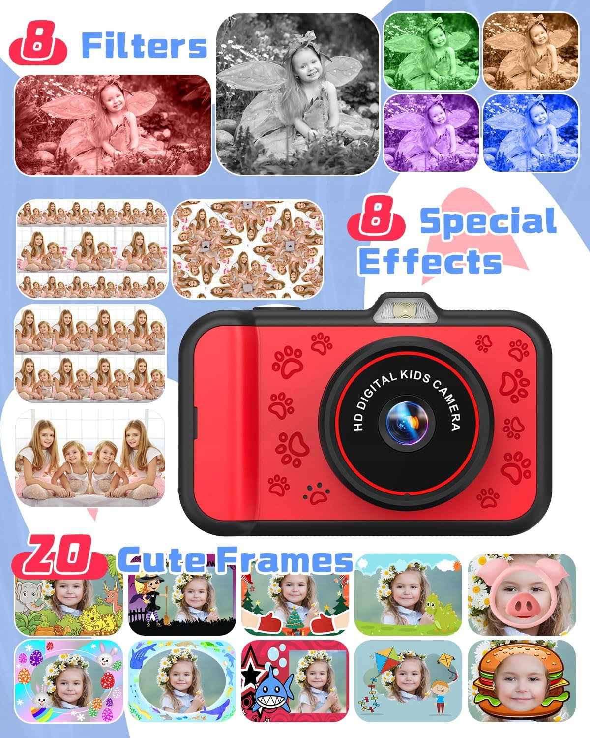 - Aparat cyfrowy dla dzieci: aparat dla dzieci ma 48-megapikselowy podwójny obiektyw z przodu i z tyłu oraz umożliwia nagrywanie wideo w rozdzielczości 1080P i 10-krotnym zoomem. Obsługa przechwytywania zdjęć, nagrywania wideo, odtwarzania, budzika, muzyki, zdjęć seryjnych, upływu czasu 3 s/5 s/10 s, 8 filtrów, 8 efektów specjalnych, 20 ramek do zdjęć, 5 gier. Dzięki kamerze Twoje dzieci będą się wspaniale bawić podczas Świąt Bożego Narodzenia, wakacji, urodzin, zajęć na świeżym powietrzu, w gronie przyjaciół i rodziny