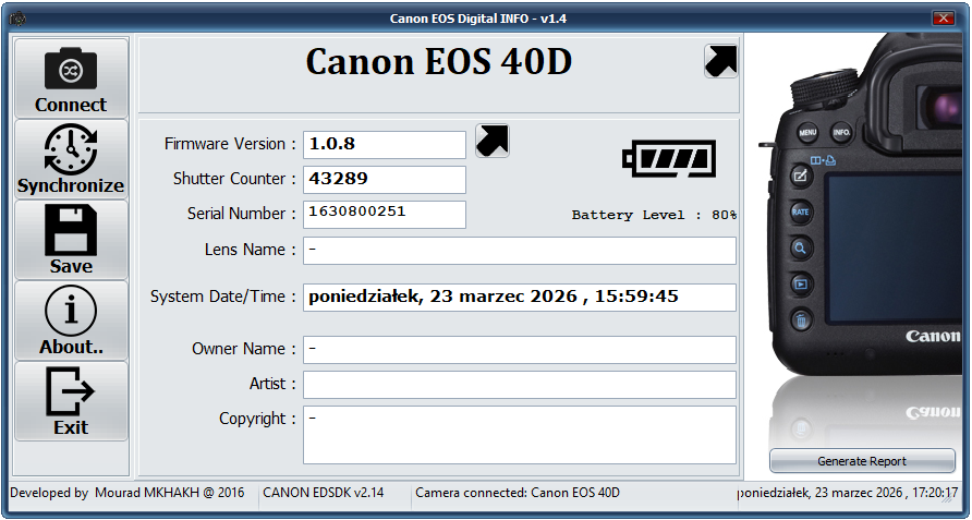#️⃣ 1x Aparat cyfrowy lustrzanka Canon EOS 40D o numerze seryjnym 1630800251