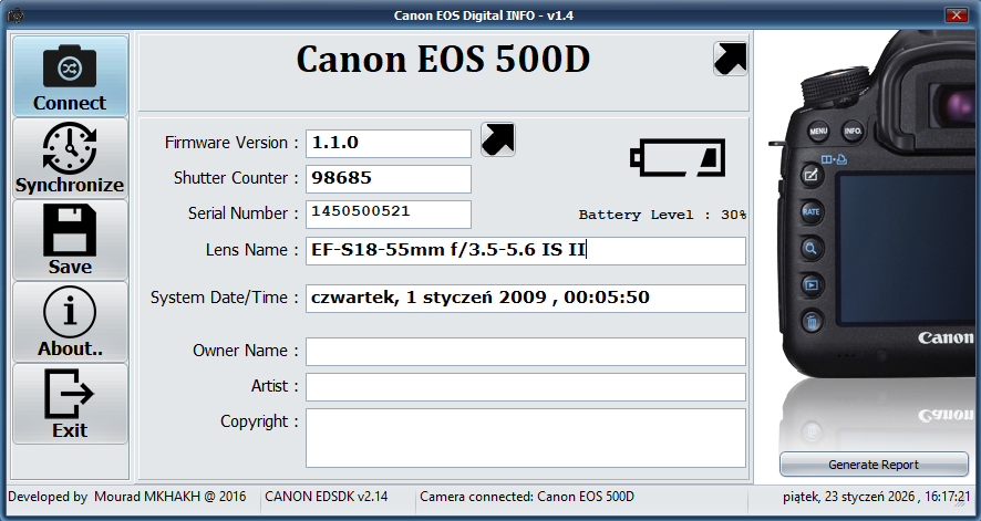 Aparat Lustrzanka Canon EOS 500D + EF-S 18-55 mm IS II / Przebieg 98685