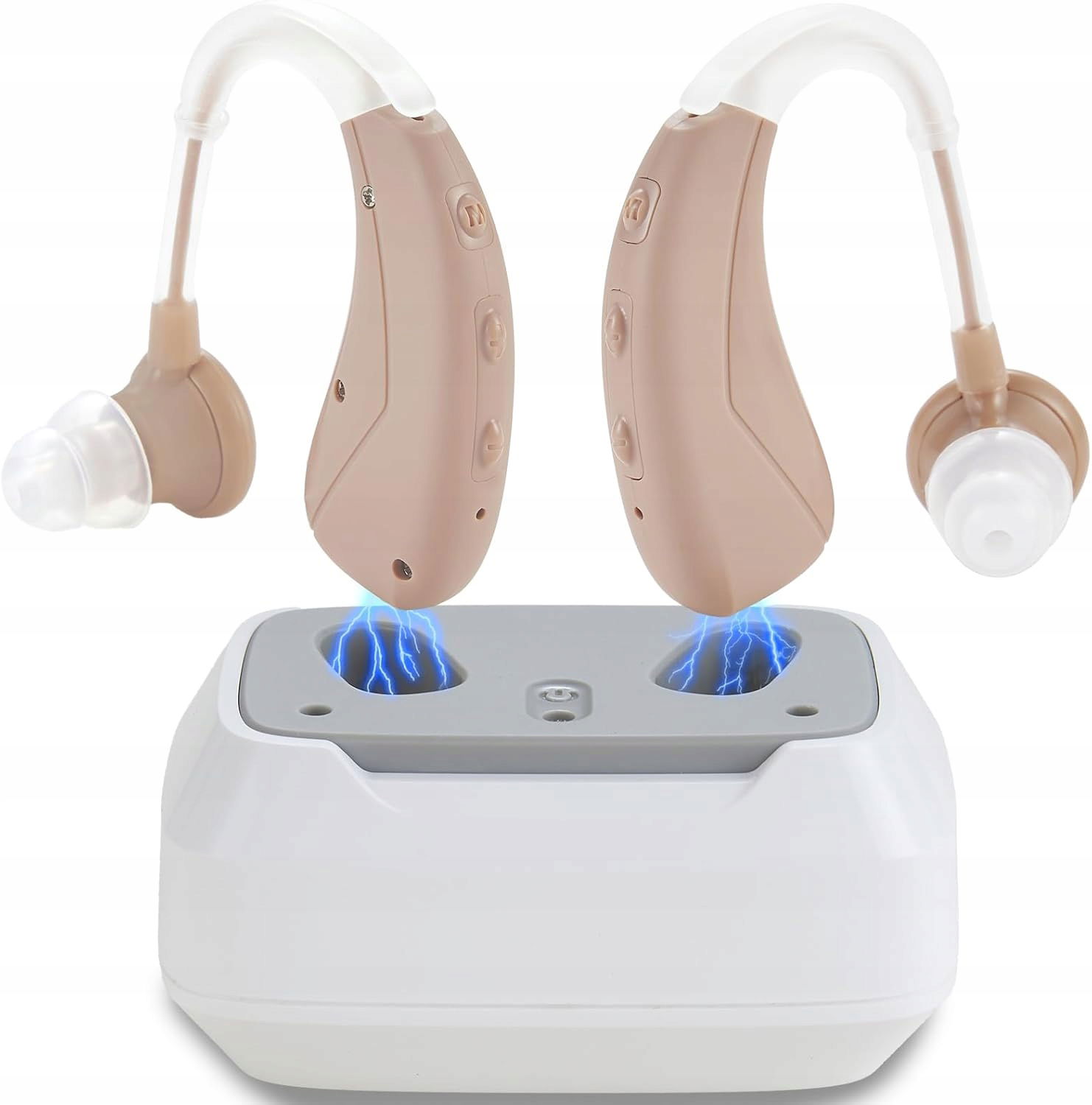 Cyfrowe, ładowalne urządzenie wspomagające słyszenie dla dorosłych i seniorów – z redukcją szumów, 4 trybami, za uchem, regulacją głośności i etui ładującym (beżowe)