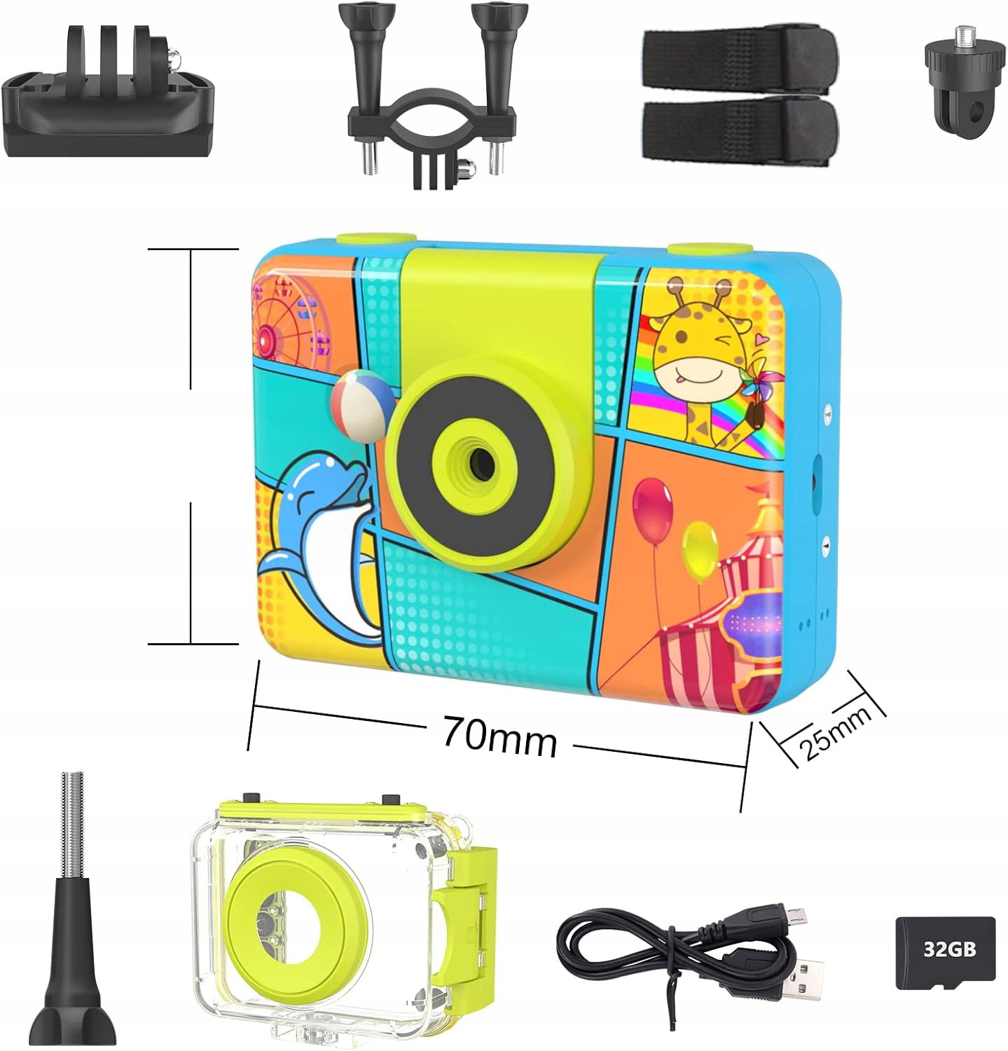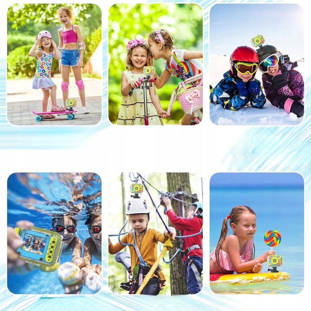 - Kompatybilność: kamera dziecięca wyposażona w wodoodporną obudowę, uchwyt na kask, pasek na kask oraz mocowanie rowerowe; umożliwia nagrywanie podwodnego świata oraz aktywności na świeżym powietrzu, takich jak jazda na rowerze, deskorolce czy nartach.