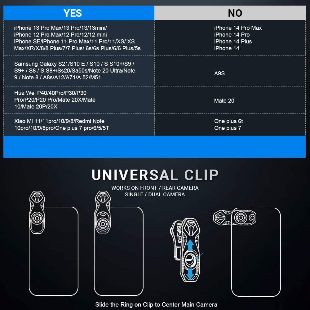 Nowy metalowy klips z szeroką szyną ze stopu aluminium i miękką podkładką silikonową pewnie mocuje obiektywy do telefonu, chroniąc ekran przed zarysowaniami. Uniwersalna zdejmowana konstrukcja zacisków ułatwia instalację, wyjmowanie i przechowywanie. Zestaw obiektywów pasuje do większości smartfonów, w tym iPhone'a i Samsunga, Huawei, a także do telefonów z pojedynczym obiektywem i podwójnym aparatem.