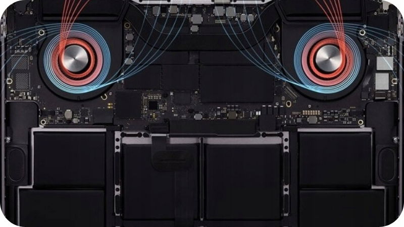 Większe wentylatory z ulepszonymi łopatkami – W MacBooku Pro A2141 zastosowano większe wentylatory z szerszymi łopatkami, które zwiększają przepływ powietrza o około 28%. Dzięki temu chłodzenie jest bardziej efektywne, a ciepło jest szybciej odprowadzane z wnętrza urządzenia.