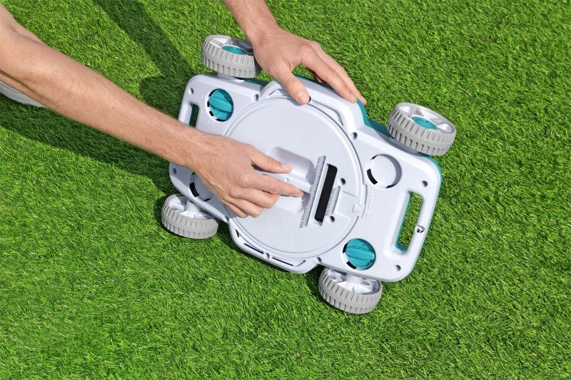 Aqua Drift porusza się po dnie basenu samodzielnie, wykorzystując antypoślizgowe, wielokierunkowe kółka, które pozwalają mu sprawnie zmieniać kierunek i docierać do wszystkich zakamarków. Ten system gwarantuje skuteczne czyszczenie każdej powierzchni – nawet w trudno dostępnych miejscach!