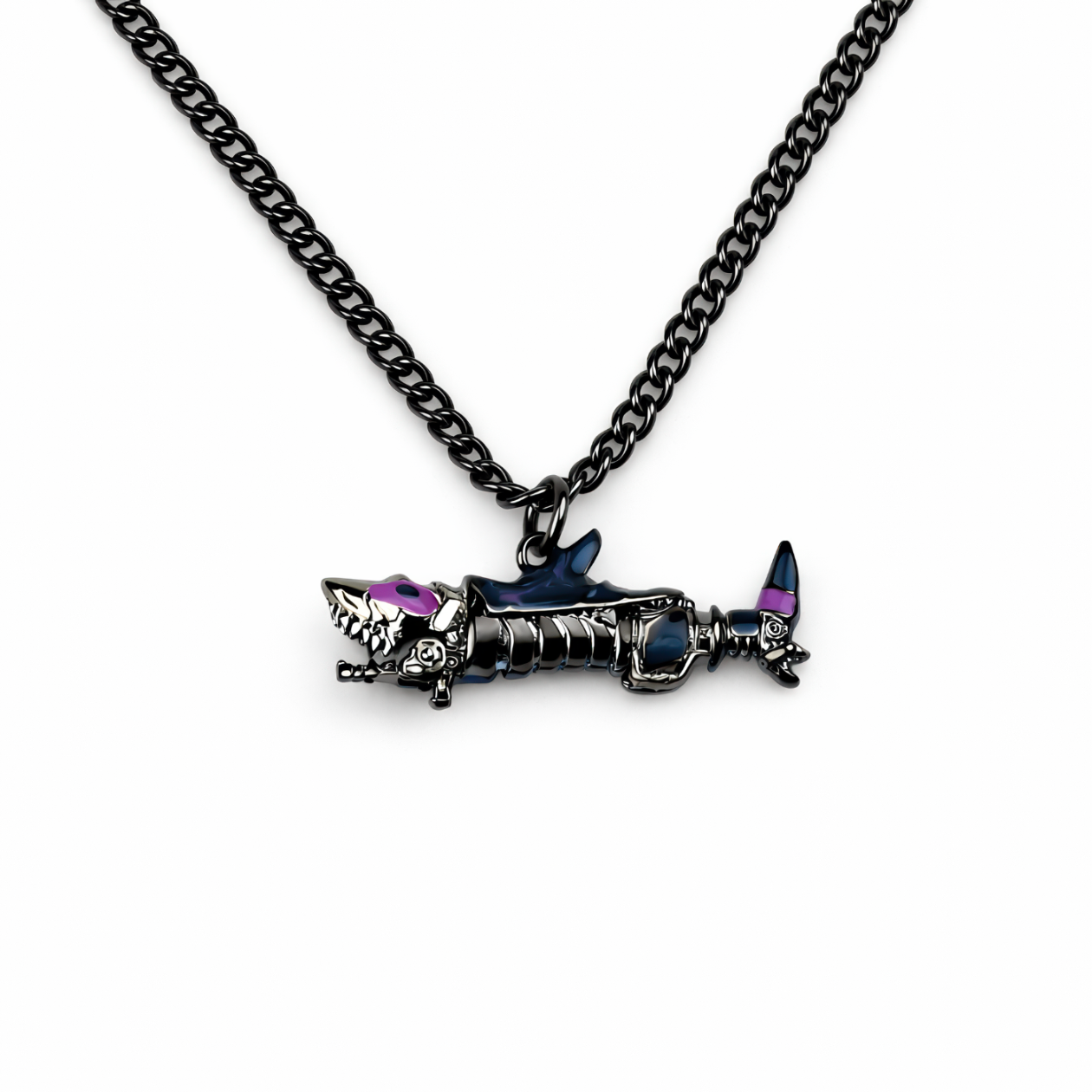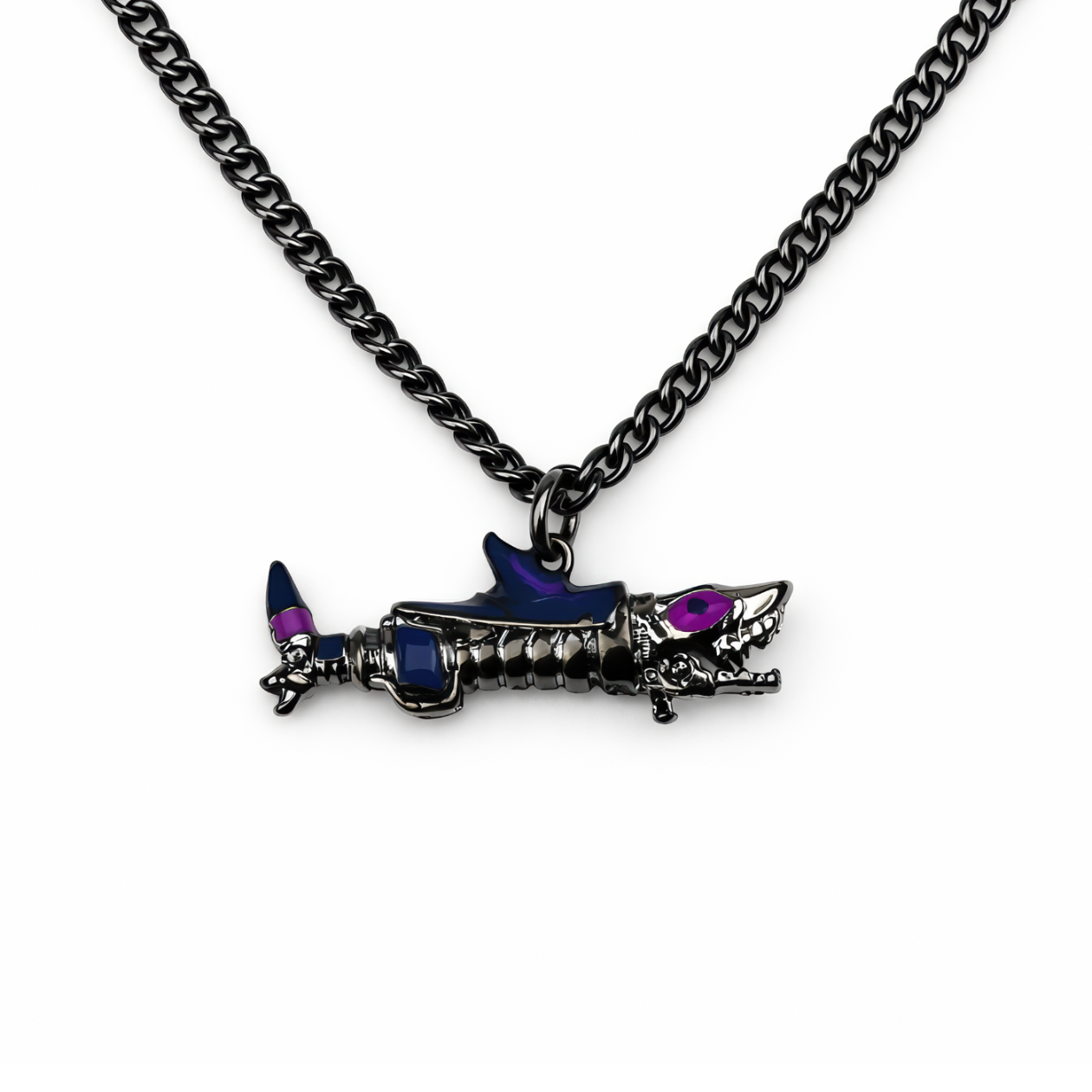 Akcentujące ciemne, gunmetalowe wykończenie metalu są eteryczne wiry głębokiego fioletowo-niebieskiego koloru, sugerujące przepływającą przez jej wzornictwo świetlistą, magiczną energię. Te opalizujące odcienie biegną wzdłuż delikatnych, przypominających płetwy wypustek, wieńczą groźnie stylizowaną głowę ryby na jednym końcu i błyszczą wewnątrz wewnętrznych konturów kości – przywołując pozaziemską moc podwodnego świata. Polerowana powierzchnia równoważy elegancką wyrafinowanie z surowym, krawędziowym charakterem, czyniąc ją idealnym elementem zarówno do codziennego noszenia, jak i dla oddanych fanów. Noś ten symbol zanurzonego mistycyzmu, aby wszędzie ze sobą nieść puls arkany głębin.
