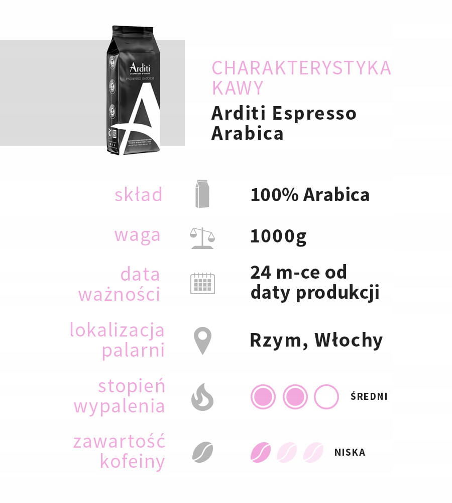 O kawie Arditi Espresso Arabica:Rodzinna palarnia Arditi Caffè, położona w sercu Rzymu, od 1961 roku tworzy mieszanki, które łączą tradycję z nowoczesnością. Każde ziarno pochodzi z wyselekcjonowanych plantacji w Ameryce Środkowej, Południowej oraz Afryce, a każda partia jest starannie prażona, aby wydobyć pełnię smaku i aromatu. Efektem jest kawa, która stanowi kwintesencję włoskiego espresso – intensywna, bogata i niepowtarzalna.