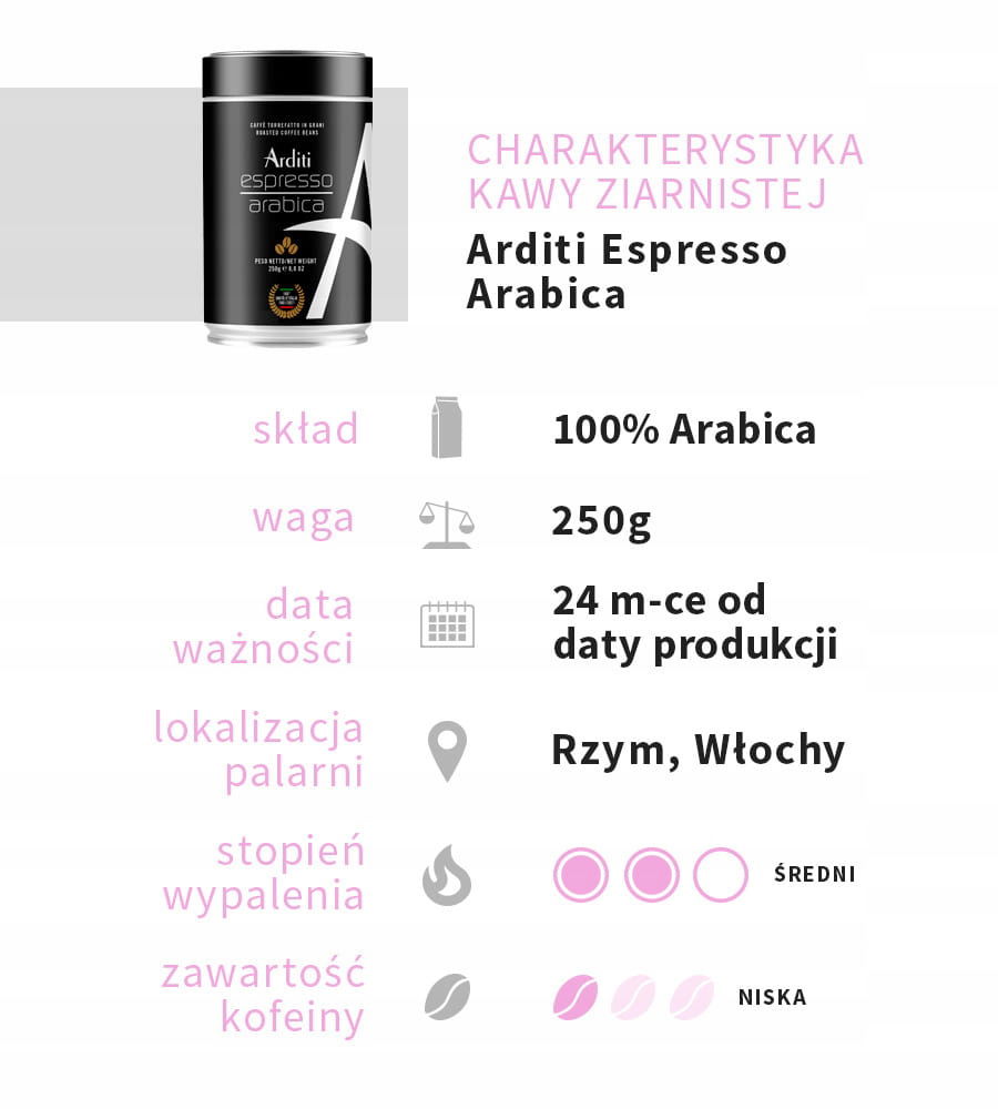 Dlaczego warto wybrać Arditi Espresso Arabica?Arditi Espresso Arabica to kawa stworzona dla tych, którzy cenią pełnię smaku, łagodną kwasowość i bogaty aromat. Jest idealna do espresso, latte, cappuccino i innych klasycznych kaw, gwarantując wyjątkowe wrażenia przy każdym łyku.