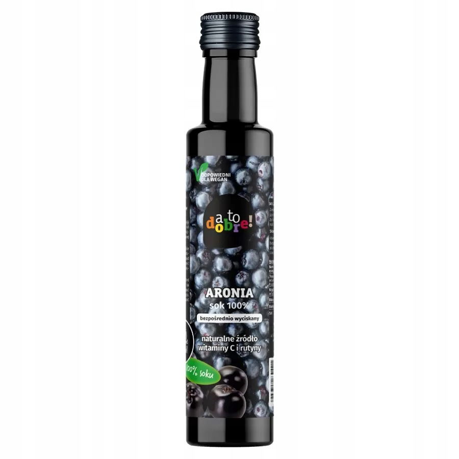Sok bezpośrednio wyciskany z owoców aronii, nie odtworzony z koncentratu (NFC). Aronia to bardzo zdrowy owoc i remedium na choroby cywilizacyjne: nadciśnienie, miażdżycę, nowotwory, schorzenia oczu i stawów. Jest owocem bogatym w przeciwutleniacze.