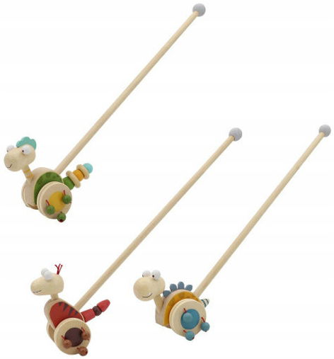 Drewniana pchanka dla dzieci w kształcie dinozaura.