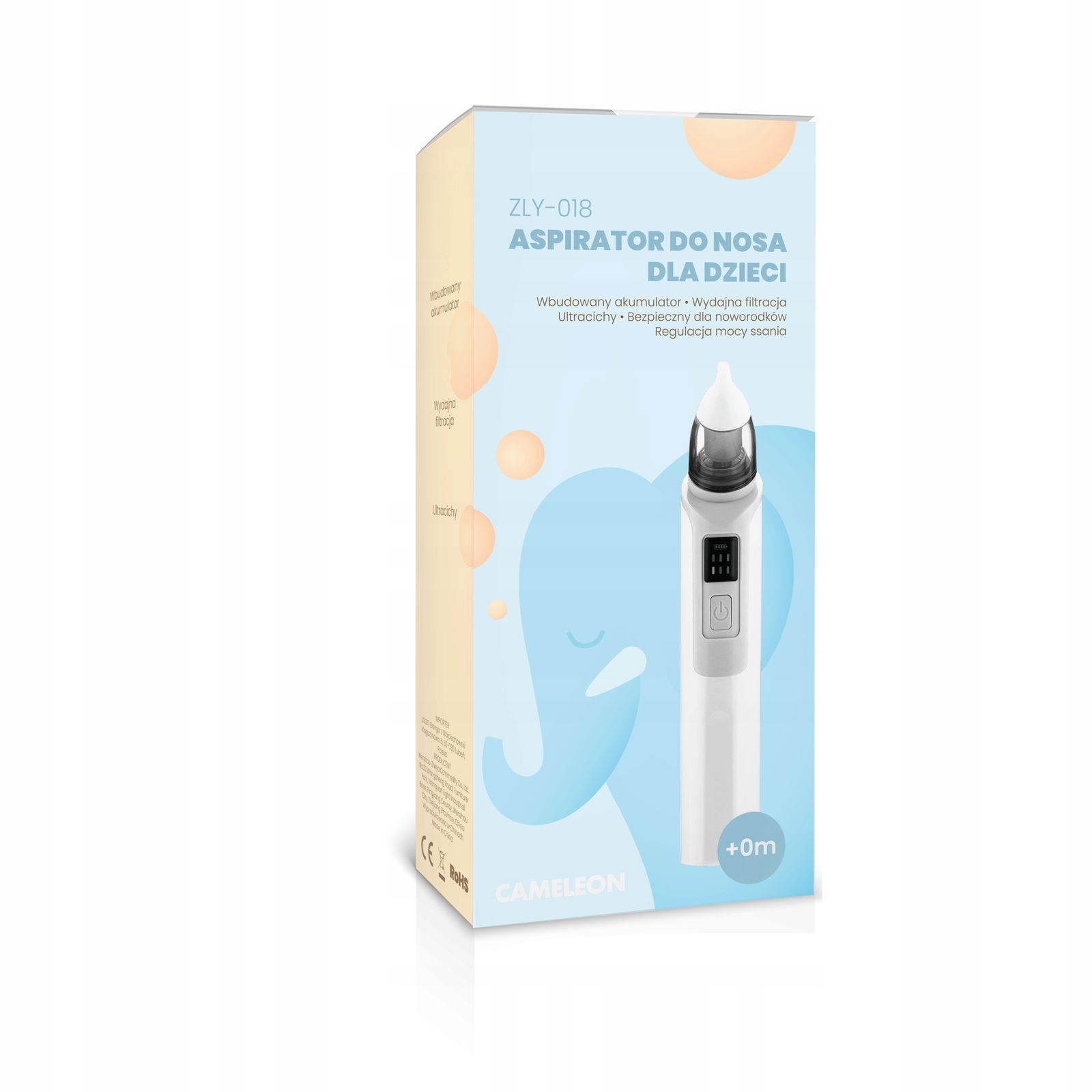Aspirator charakteryzuje się zbiornikiem umożliwiającym łatwe czyszczenie oraz higienicznym materiałem, który nie powoduje podrażnień. Końcówki do nosa oraz zbiorniczek na wydzielinę można sterylizować, co zapewnia bezpieczeństwo i higienę użytkowania urządzenia.