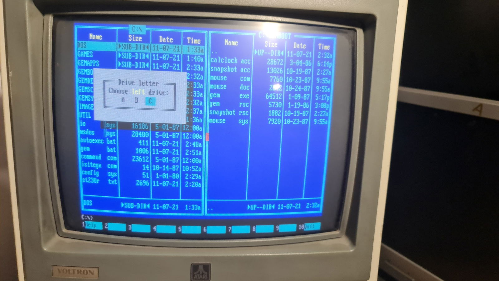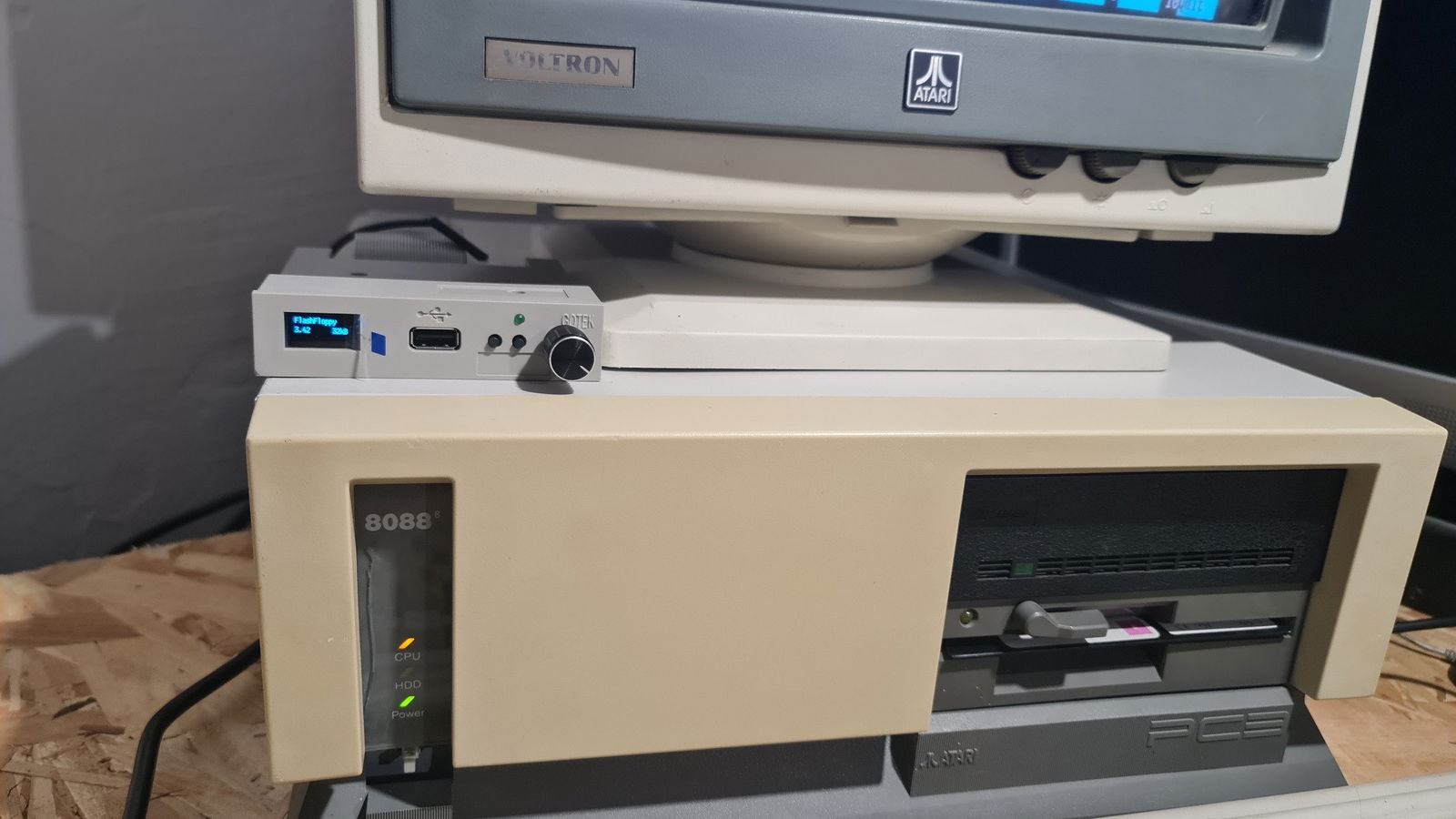Emulator stacji dyskietek Gotek z taśmą IDC, kablem zasilającym stację z ładowarki (lub powerbank) oraz gniazdo z wtyczką do Atari PC1, PC3 (w Atari PC2, PC4 i PC5 sprawdź czy jest wejście z gniazdem DIN14 oznaczone jako Floppy). Całość podłączamy i działa jako zewnętrznastacja B w Atari PC1, PC3.