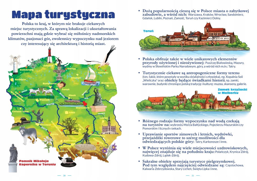 Niniejszy atlas został stworzony, by pomóc najmłodszym w zdobyciu podstawowych informacji o Polsce. Dzięki książce dziecko pozna nasze morze, rzeki, jeziora, niziny, wyżyny, góry, parki narodowe i krajobrazowe, faunę oraz florę. Przedstawione w niej zostały również regiony kulturalne i historyczne, a także stroje charakterystyczne dla poszczególnych krain. Przejrzyste teksty są urozmaicone kolorowymi ilustracjami, a liczne ciekawostki oraz barwne mapy sprawiają, że nauka staje się zabawą. Dodatkową atrakcję stanowi zestaw 50 naklejek dołączony do każdego egzemplarza.