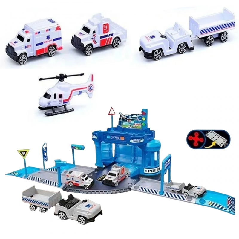 Zamiast klasycznego garażu piętrowego, ten zestaw przedstawia posterunek policji przy lotnisku wraz z pojazdami, helikopterem i dużą, rozkładaną matą z nadrukiem pasów startowych. Bogaty komplet akcesoriów i różnorodne pojazdy zapewnią wiele godzin kreatywnej zabawy i rozwiją wyobraźnię Twojego dziecka.