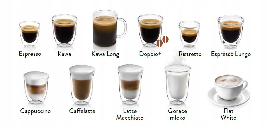 - Dostępne napoje: Cappuccino, Cappuccino Mix, Cappuccino+, Doppio, Espresso, Flat White, Latte, Latte Macchiato, Long, Lungo
