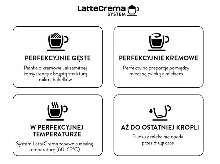 - Automatyczny system spieniania mleka LatteCrema pozwala uzyskać kremową, gęstą i trwałą mleczną piankę o idealnej temperaturze